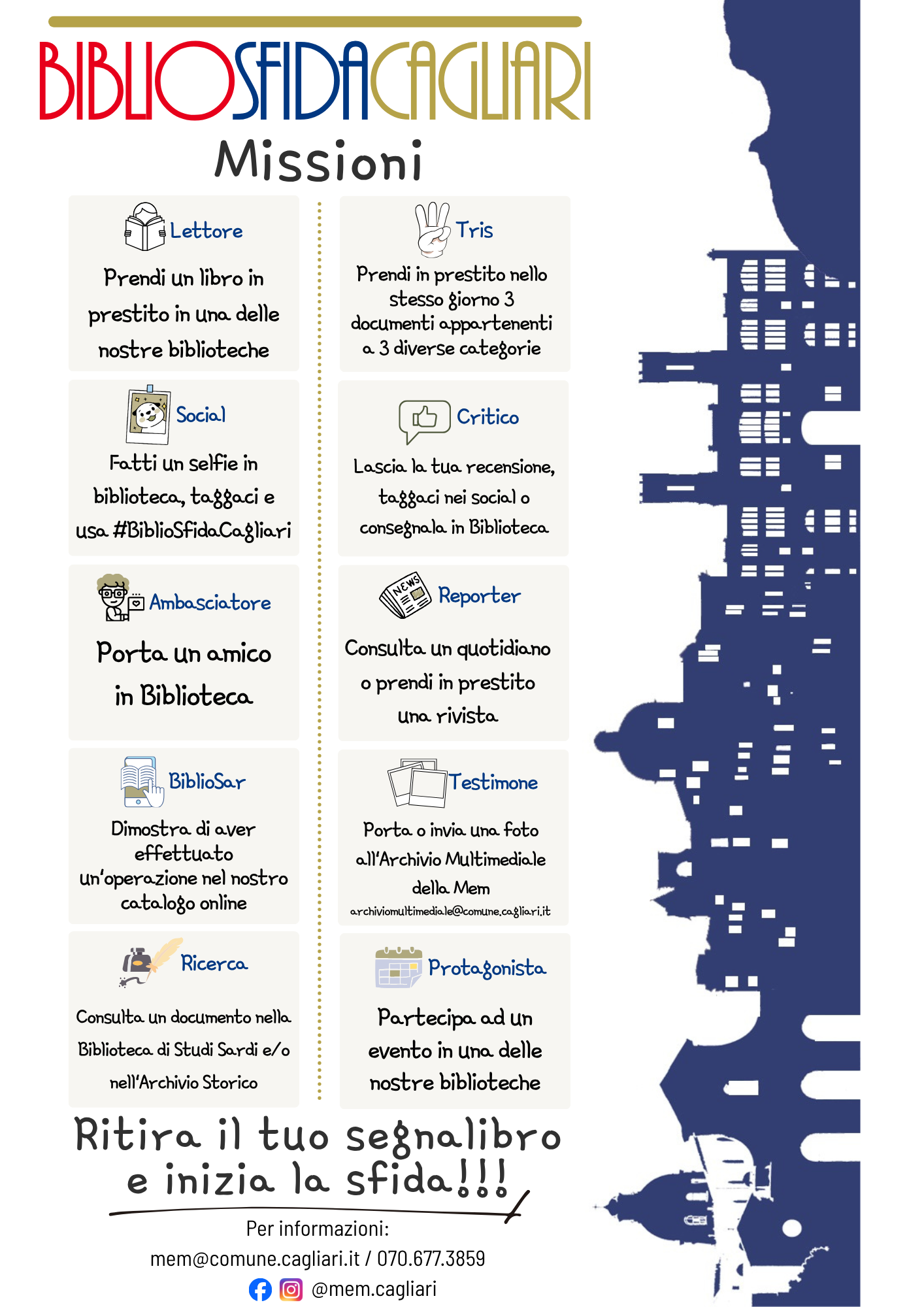Social: Fatti un selfie in una delle nostre biblioteche, taggaci nei nostri profili ufficiali https://www.facebook.com/mem.cagliari https://www.instagram.com/mem.cagliari/ e inserisci l'hastag #BiblioSfidaCagliari