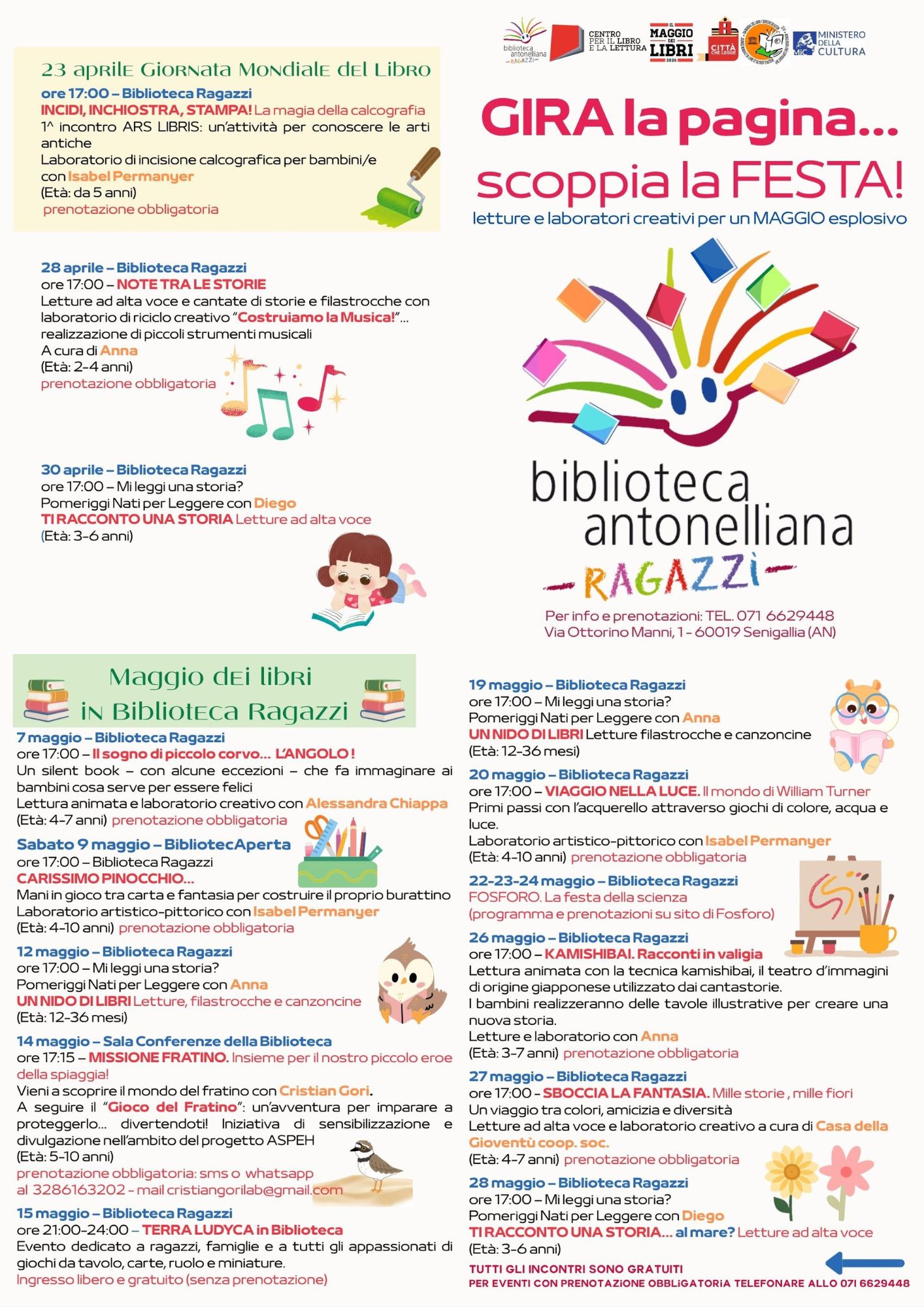 In occasione de Il Maggio dei Libri, la biblioteca ragazzi si trasforma in un luogo incantato dove storie, colori e creatività prendono vita con la rassegna “Gira la pagina… scoppia la festa! Letture e laboratori creativi per un Maggio esplosivo”: un ricco calendario di appuntamenti pensati per accompagnare bambini e bambine in un viaggio fatto di parole, musica, arte e fantasia.