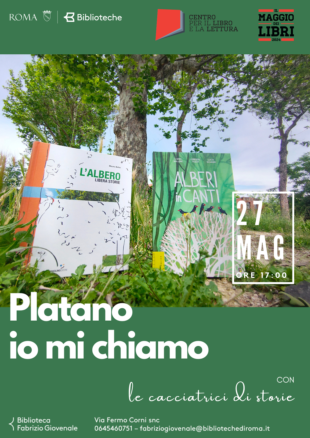 Per il filone “Lib(e)ri di conoscere”, vi aspettiamo nella biblioteca Fabrizio Giovenale lunedì 27 maggio alle ore 17 con "Platano io mi chiamo": partiremo dalla lettura di Alberi InCanti, di Chiara Sallemi, Lorenzo Tozzi, Lucia Scuderi (Fulmino 2020), e di L'Albero Libera Storie, di Mauro Bellei (Occhiolino Edizioni 2019), per esplorare i platani del nostro parco, scoprendone le caratteristiche e toccando con mano la sua corteccia mimetica e le sue grandi foglie, che saranno utilizzate per il laboratorio artistico realizzato con la tecnica del frottage.