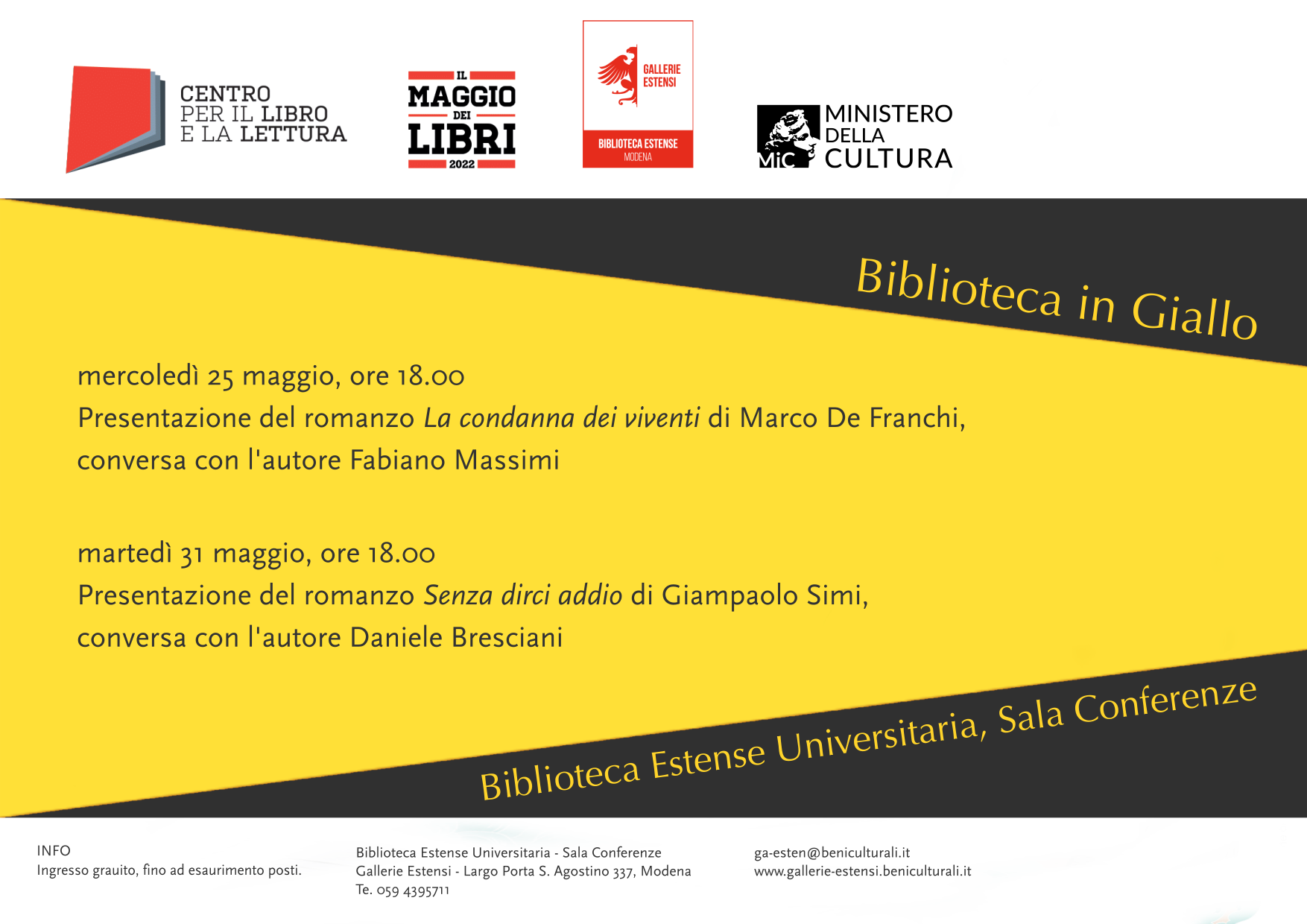 Mercoled?? 25 maggio, alle ore 18, nella sala conferenze della Biblioteca Estense Universitaria, lo scrittore modenese Fabiano Massimi presenter?? Marco De Franchi, autore del thriller La condanna dei viventi (Longanesi 2022).