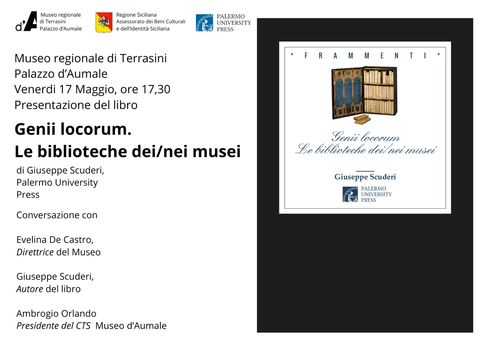 A Palazzo d'Aumale, sede del Museo regionale interdisciplinare di Terrasini, alle ore 17,30, sarà presentato il libro "Genii locorum. Le biblioteche dei/nei musei". Conversazione co Evelina De Castro, Direttrice del Museo, Giuseppe Scuderi, autore del libro, e Ambrogio Orlando, presidente del CTS Museo d'Aumale.