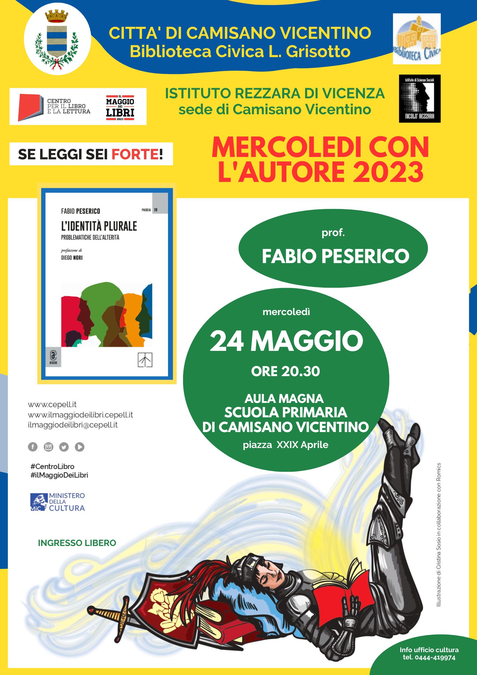 Nell'ambito dei MERCOLEDI CON L'AUTORE mercoledì 24/05/2023, alle ore 20.30, presso l’aula magna della scuola primaria di Camisano Vicentino, viene presentato il libro L’IDENTITÀ PLURALE. Problematiche dell’alterità del prof. Fabio Peserico, Il libro dell’apprezzato filosofo Peserico rientra nel primo filone del "Maggio dei Libri 2023". Attraverso il pensiero dell’autore e le sue riflessioni su quello di illustri pensatori, avremo l’opportunità di vivere un viaggio nella storia antropologica dell’uomo dove la “speranza e il dialogo” diventano la luce che lo orienta nella difficile ricerca di se stesso e dei suoi simili, dentro e fuori se stesso. Un’opera che ci farà riflettere sul fatto che per amare bisogna conoscere e sapersi ri-conoscere. L’Altro, se sappiamo osservare, è il nostro specchio, in lui vediamo noi e solo nel “noi” troviamo un senso alla nostra Umanità. L’Altro ci può impaurire, irritare, o destabilizzare, solo la sua conoscenza ci permette di assaporare nuovi orizzonti di comprensione, di compassione e di condivisione che daranno enorme senso alla nostra breve esperienza di Vita.