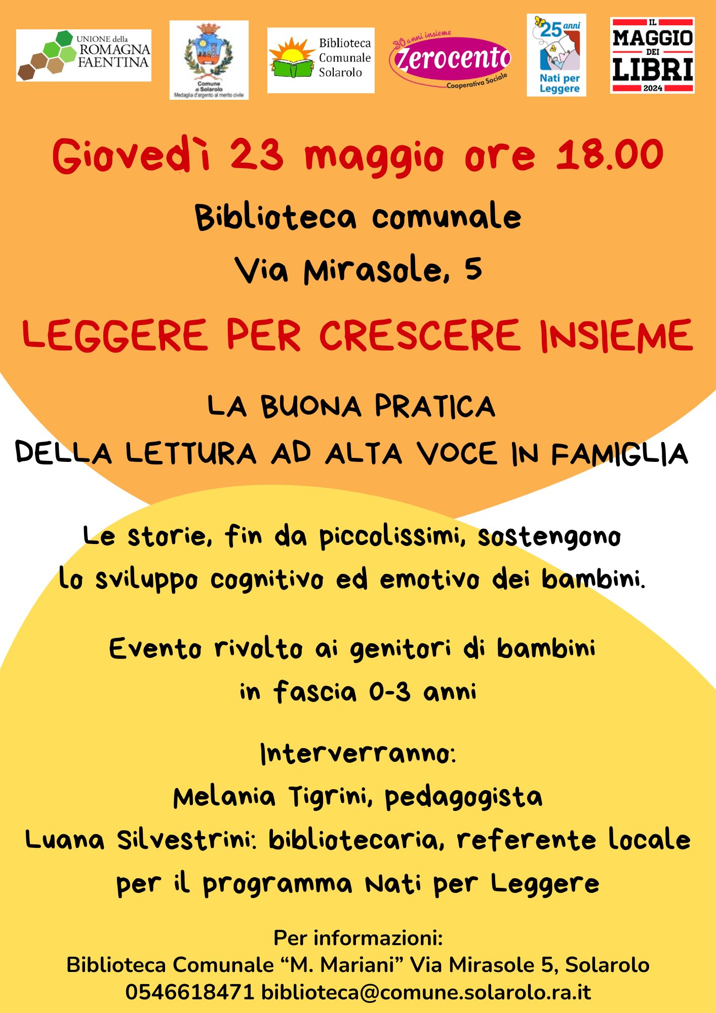 "Leggere per crescere insieme" è un appuntamento rivolto a genitori di bambini in fascia 0-3 anni, che vuole fare conoscere i benefici della buona pratica della lettura in famiglia, stimolare la frequenza al prestito librario in biblioteca, unitamente alla promozione del programma di Nati per Leggere. Seguiranno consigli sull'importanza di scegliere libri adatti all'età e soprattutto di qualità.