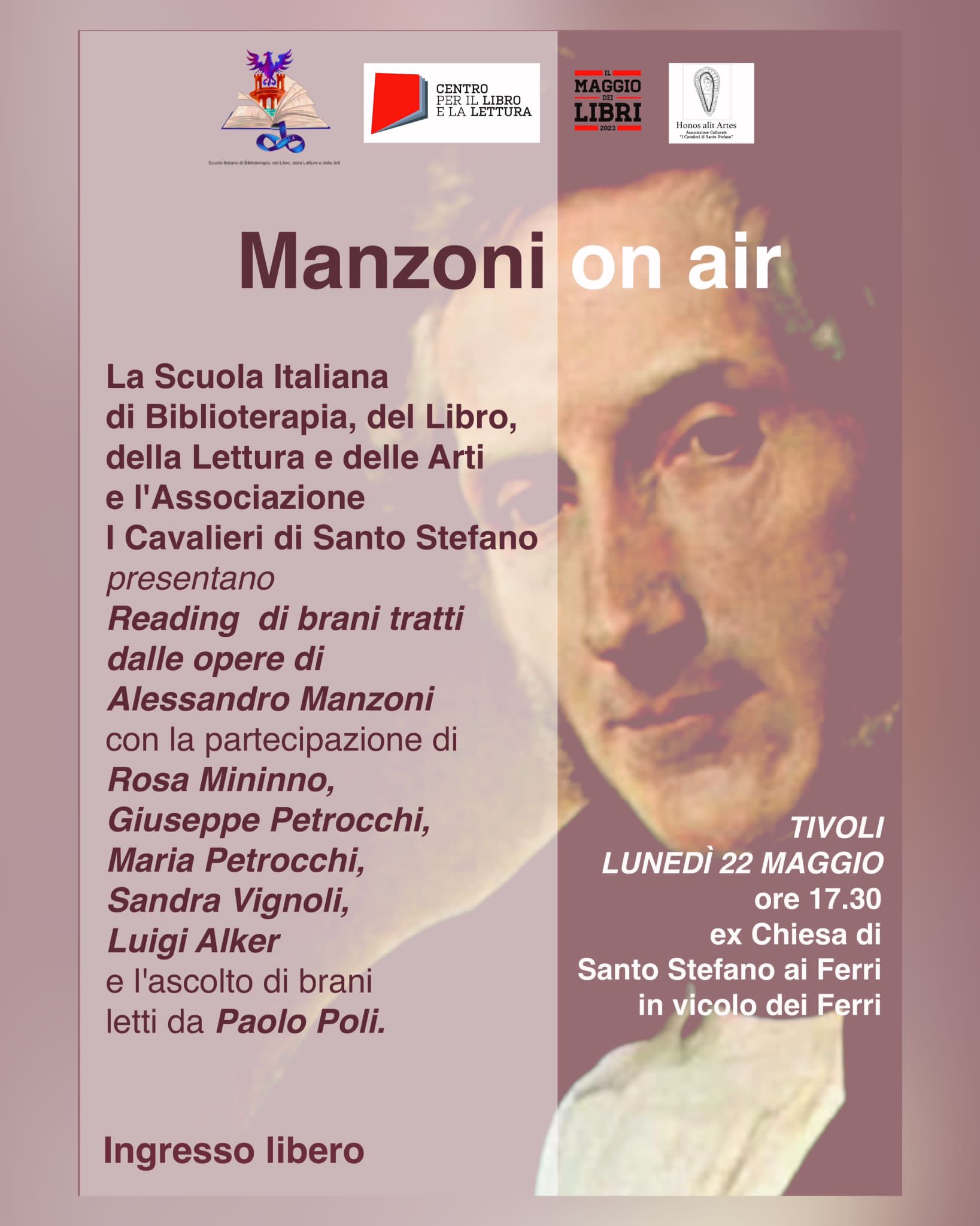La Scuola Italiana di Biblioterapia, del libro, della lettura e delle arti , presieduta dalla Dott.ssa Rosa Mininno e l'Associazione I Cavalieri di Santo Stefano , presieduta dalla Prof.ssa Sandra Vignoli, aderiscono all'evento nazionale Manzoni On air con il Reading di brani tratti dalle opere di Alessandro Manzoni e con l'ascolto e la diffusione anche sui propri canali social : Meta, YouTube e Instagram dei brani letti da Paolo Poli, messi a disposizione dal Centro per il Libro e la lettura.
