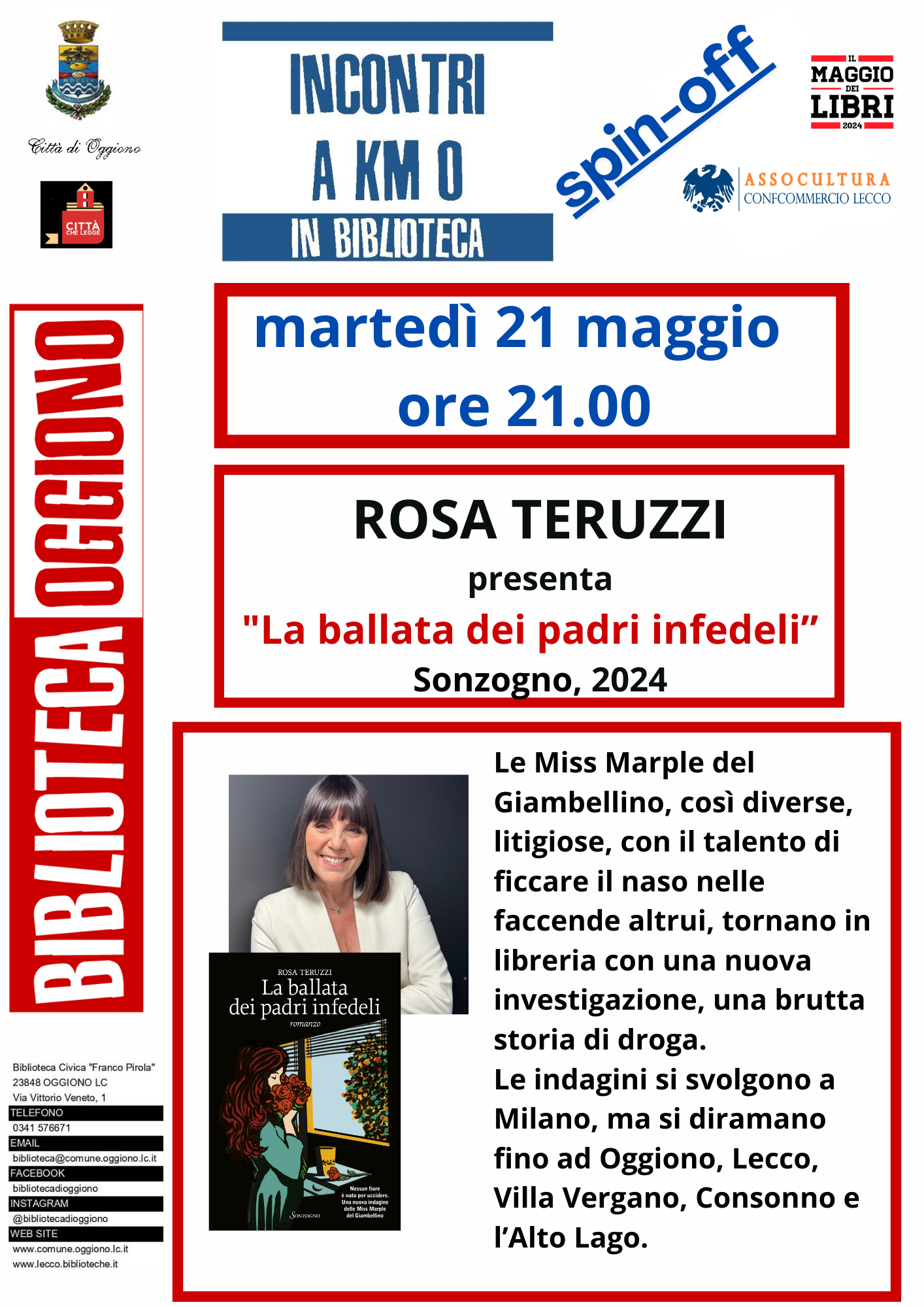 Martedì 21 maggio, alle ore 21:00, presso la Biblioteca di Oggiono, l'autrice Rosa Teruzzi presenterà il suo nuovo giallo, La ballata dei padri infedeli, edito da Sonzogno nel 2024.