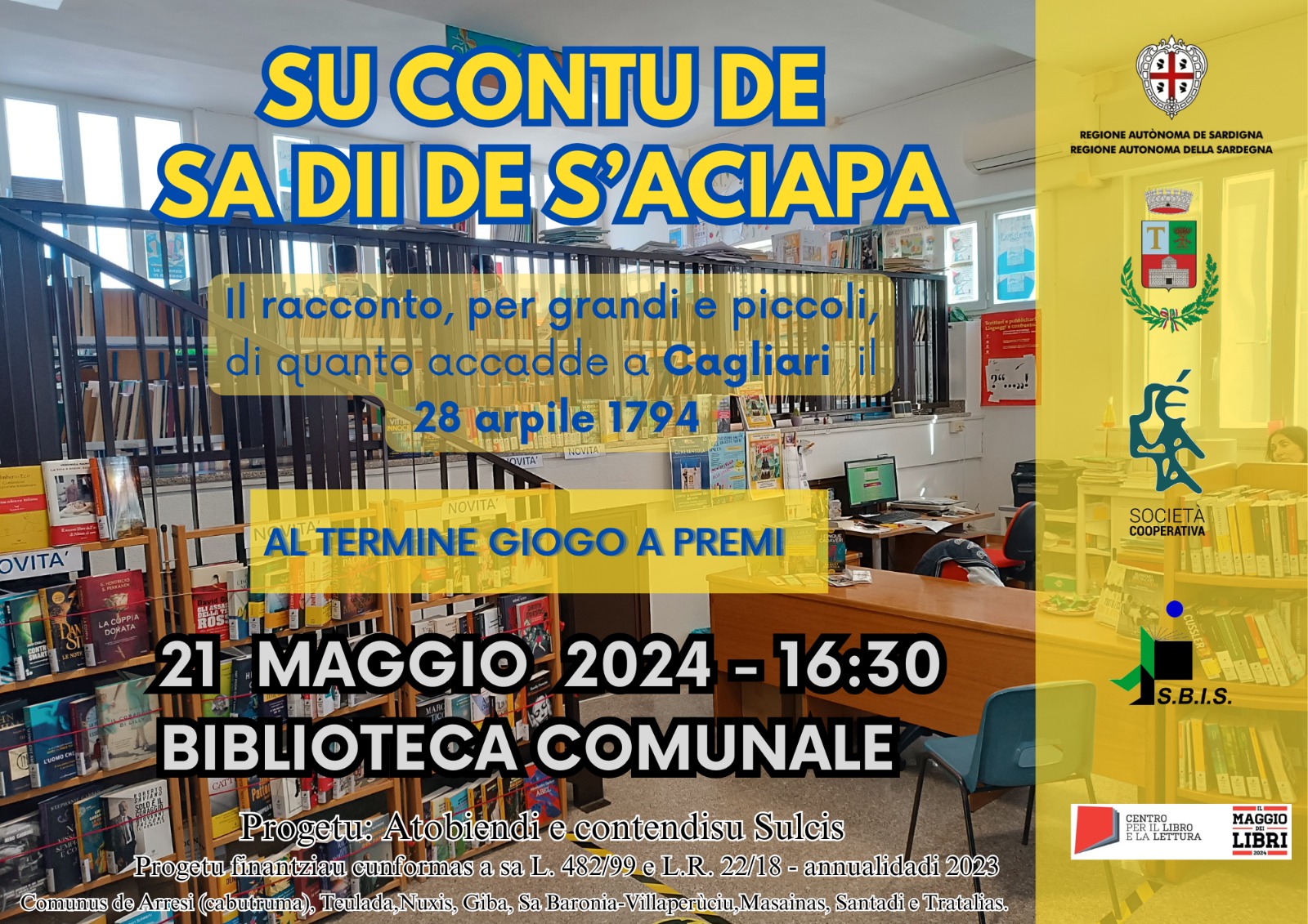 La Biblioteca Comunale e lo Sportello Lìngua Sarda del Comune di Tratalias organizzano per il giorno 21 maggio, alle ore 16:30 “ Su contu de sa dii de s’aciapa”, il racconto, dedicato ai ragazzi di tutte le età e agli adulti curiosi, dei fatti accaduti a Cagliari il 28 aprile del 1794.