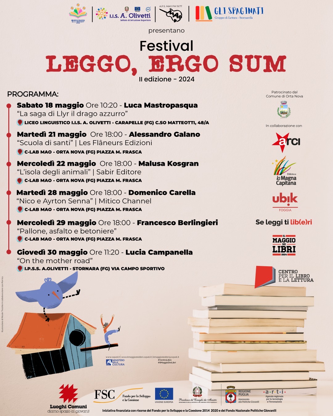 Al via la seconda edizione del Festival "Leggo, ergo sum" rassegna culturale organizzata per il *Maggio* *dei* *Libri* dall'*I.I.S.* *Adriano* *Olivetti*, *MAO* *FM* *19.77* e il *Gruppo* *di* *Lettura* "*Gli Spaginati*" di Stornarella (tutti sottoscrittori del *Patto* *per* *la* *Lettura* *del* *Comune* *di* *Orta Nova*), in collaborazione con la *Biblioteca La Magna Capitana* e la *libreria UBIK di Foggia*.