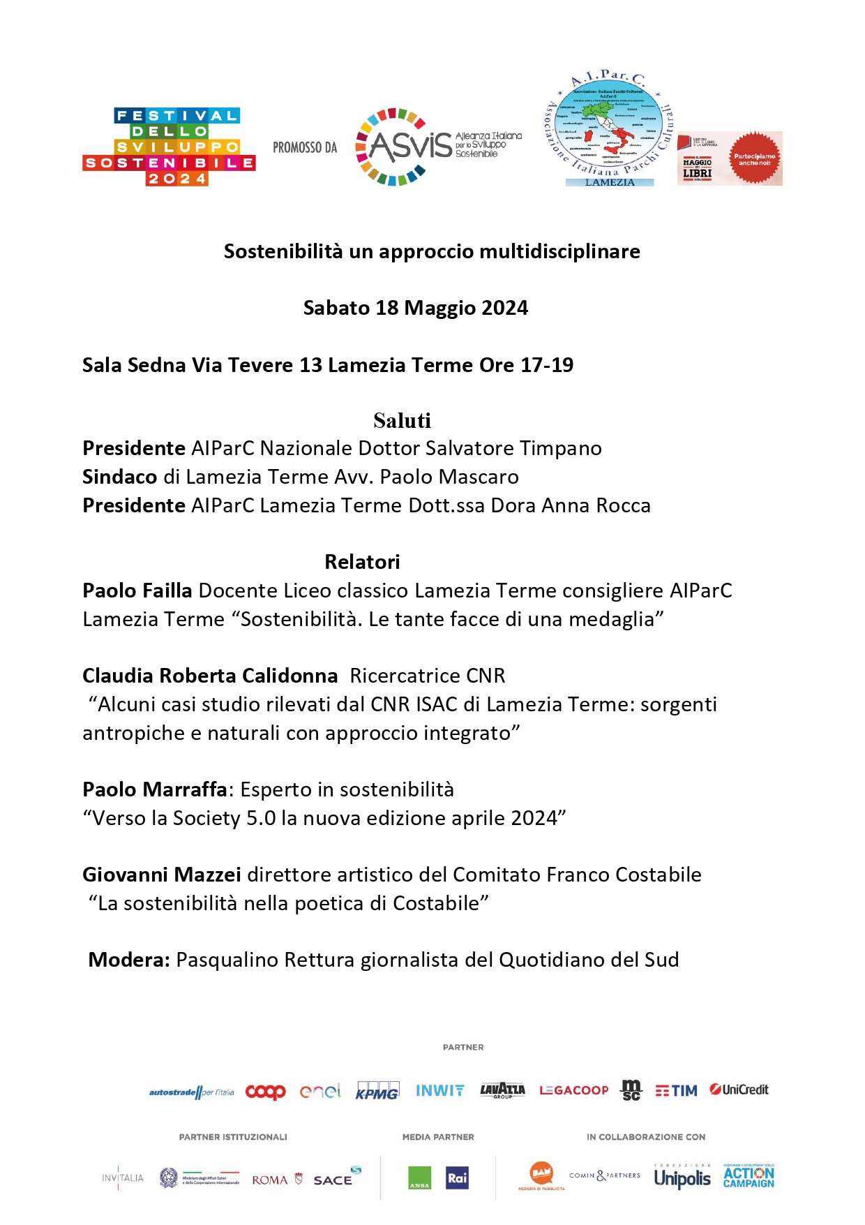 Un fantastico connubio tra Festival dello sviluppo sostenibile 2024 e Maggio dei libri 2024, il 18 Maggio a Lamezia Terme, Provincia di Catanzaro in Calabria. AIparC Lamezia Terme associazione no profit intende realizzare una iniziativa che si occupi di sostenibilità a 360 gradi, non tralasciando il meraviglioso mondo dei libri fonte privilegiata di cultura. Infatti, nell'ambito dell'evento del 18 Maggio presenteremo il libro Verso la society 5.0 Delfino editoriale, la cui seconda edizione ricca di aggiornamenti è fresca di stampa (aprile 2024), inoltre in occasione del centenario della nascita del poeta lametino Franco Costabile sarà decantata una poesia del poeta sulla sostenibilità . A rendere l'evento ancora più prestigioso sono gli interventi sulla sostenibilità della dottoressa Claudia Calidonna del C.N.R. e del docente di fisica specializzato anche
