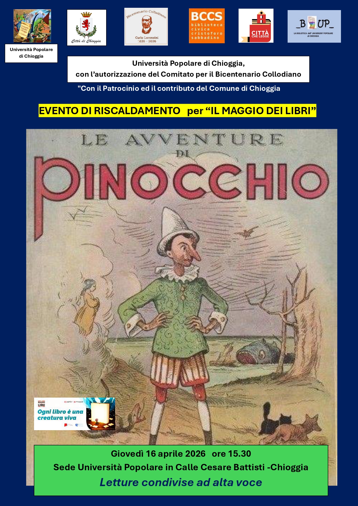 Il pomeriggio sarà scandito dalla lettura di parti del romanzo di Collodi, con monologhi originali, dialoghi, osservazioni, discussioni… e una performance narrativa dal titolo "Nel Campo dei Miracoli" con una Lettera a Geppetto..