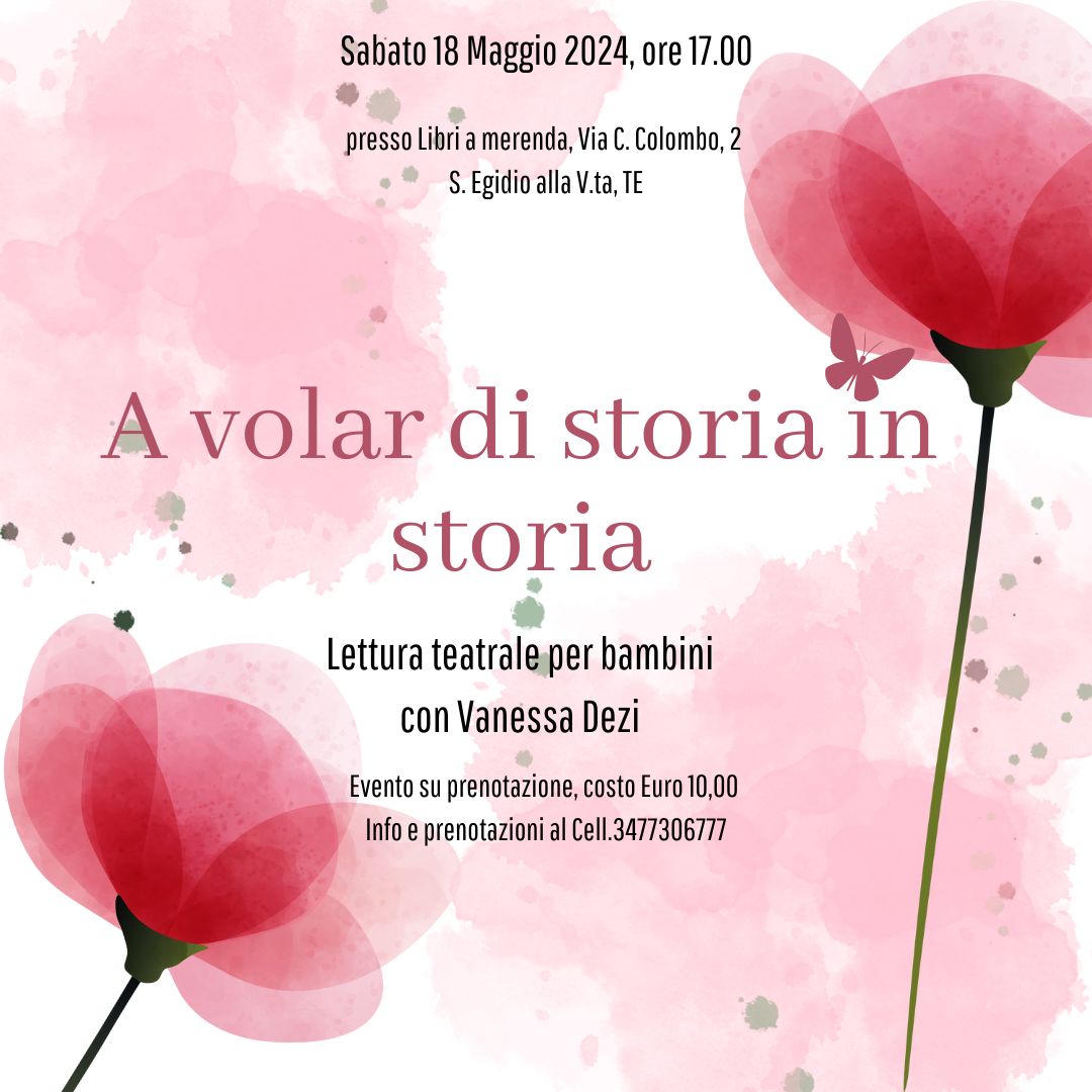 "A volar di storia in storia" è una lettura teatrale per bambini e per chi ricorda di essere stato bambino, a cura di Vanessa Dezi, attrice passeuse di libri. L'idea è quella di seguire il volo spezzettato e imprevedibile di una farfalla che si posa di tanto in tanto sui libri - fiori di una libreria colorata, come "Libri a merenda" di Chiara Bordone, che si fa giardino per un pomeriggio di Maggio.