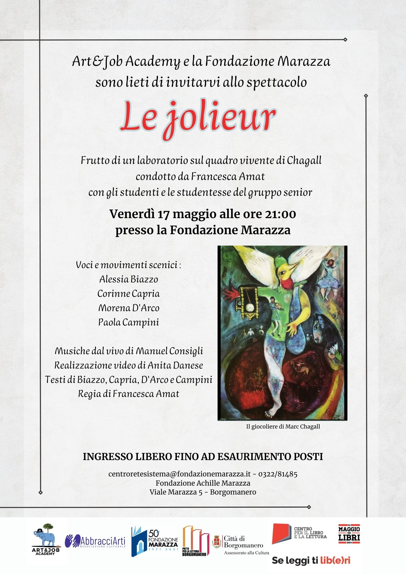 A partire da un laboratorio sul quadro vivente di Chagall, gli studenti e le studentesse del gruppo senior del corso tenuto da Francesca Amat di Art & Job Academy, hanno elaborato uno spettacolo in cui si intersecano arte, poesia, musica e interazione con il pubblico.