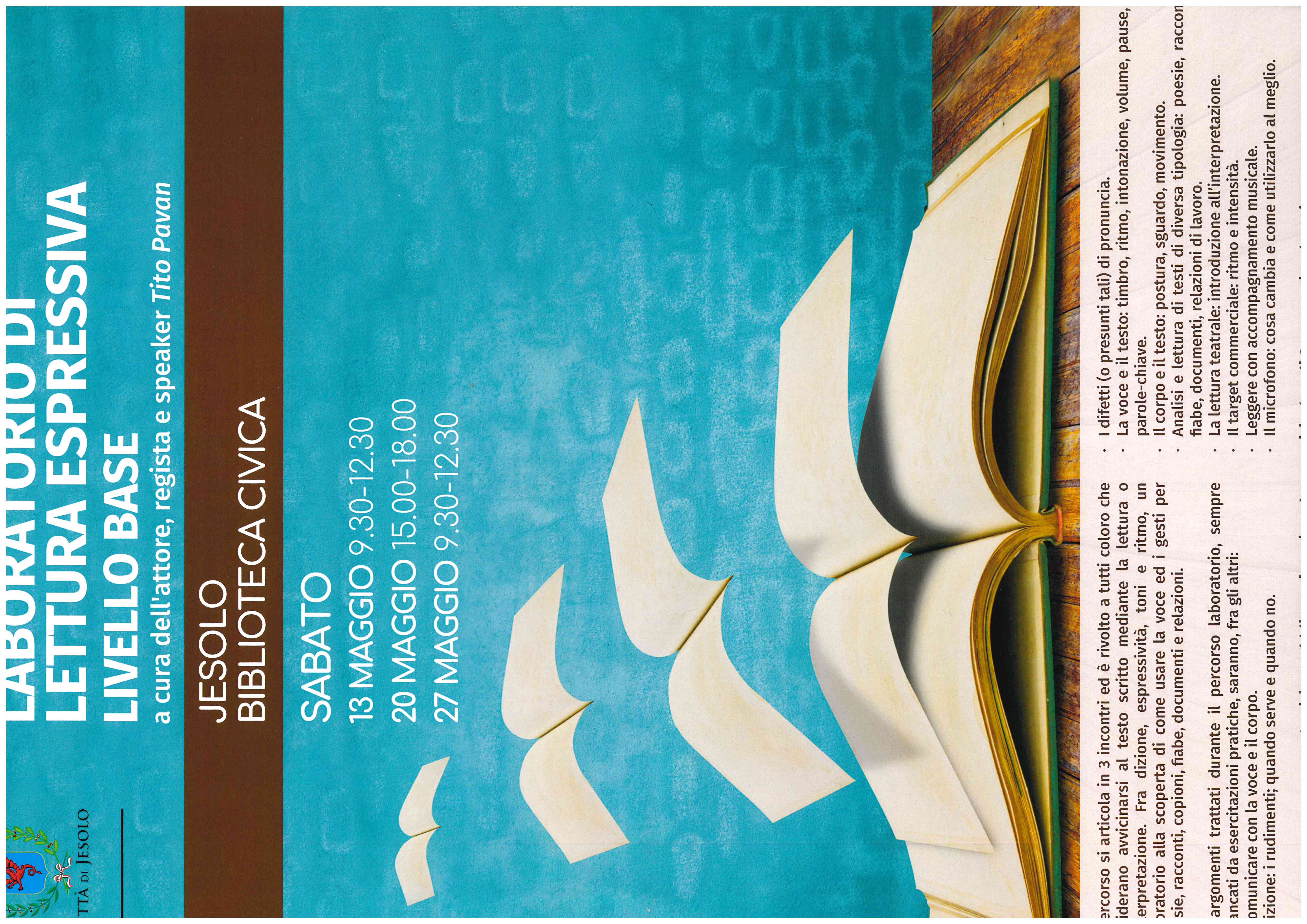 ll corso è rivolto a tutti coloro che desiderano avvicinarsi al testo scritto mediante la lettura o l’interpretazione. Fra dizione, espressività, toni e ritmo, un laboratorio alla scoperta di come usare la voce ed i gesti per poesie, racconti, copioni, fiabe, documenti e relazioni. Il corso si configura come un laboratorio, dove, attraverso la pratica e anche il confronto, si acquisiranno le tecniche e si affinerà la sensibilità per pronunciare correttamente le parole, interpretare senso e atmosfere di un testo e leggerlo espressivamente, dopo aver investigato suoni e colori della parola e della voce.