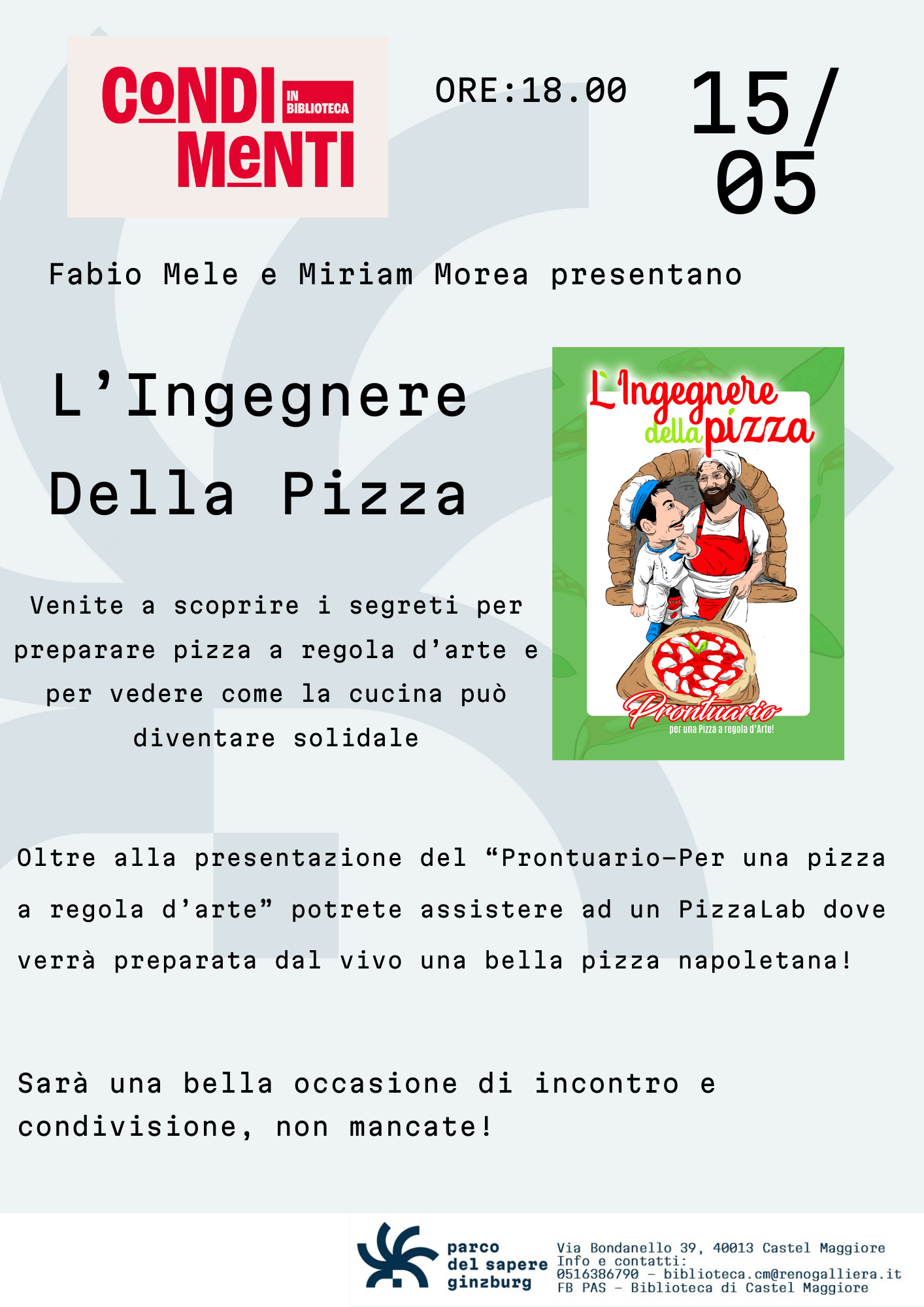 Vieni a scoprire i segreti della pizza con “L’ingegnere della pizza”! Scoprirai non solo come preparare una pizza a regola d’arte ma vedrai come la cucina diventa solidale. La presentazione del “Prontuario-Per una pizza a regola d’arte” include anche un PizzaLab dove potrai vedere dal vivo come preparare una bella pizza napoletana! Sarà una bella occasione di incontro e condivisione, non mancare!