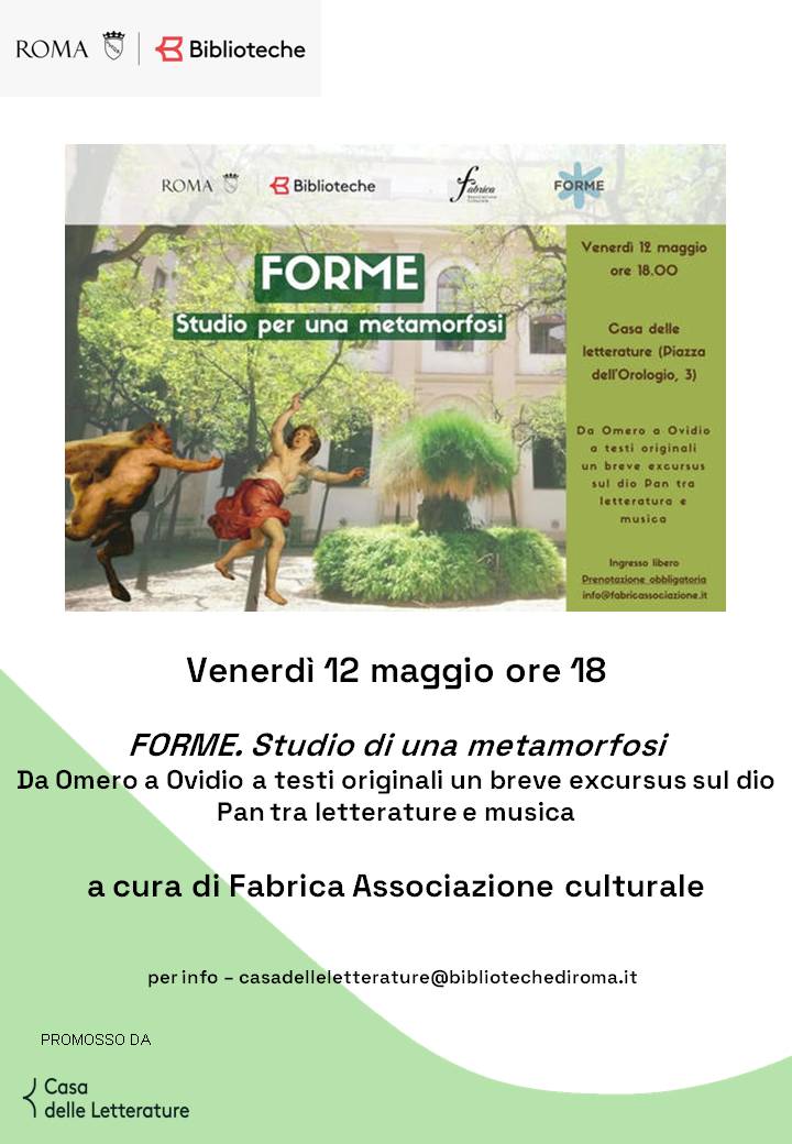Appuntamento venerdì 12 maggio ore 18 presso la Casa delle Letterature con Forme. Studio per una metamorfosi. Da Omero a Ovidio a testi originali un breve excursus sul dio Pan tra letteratura e musica.