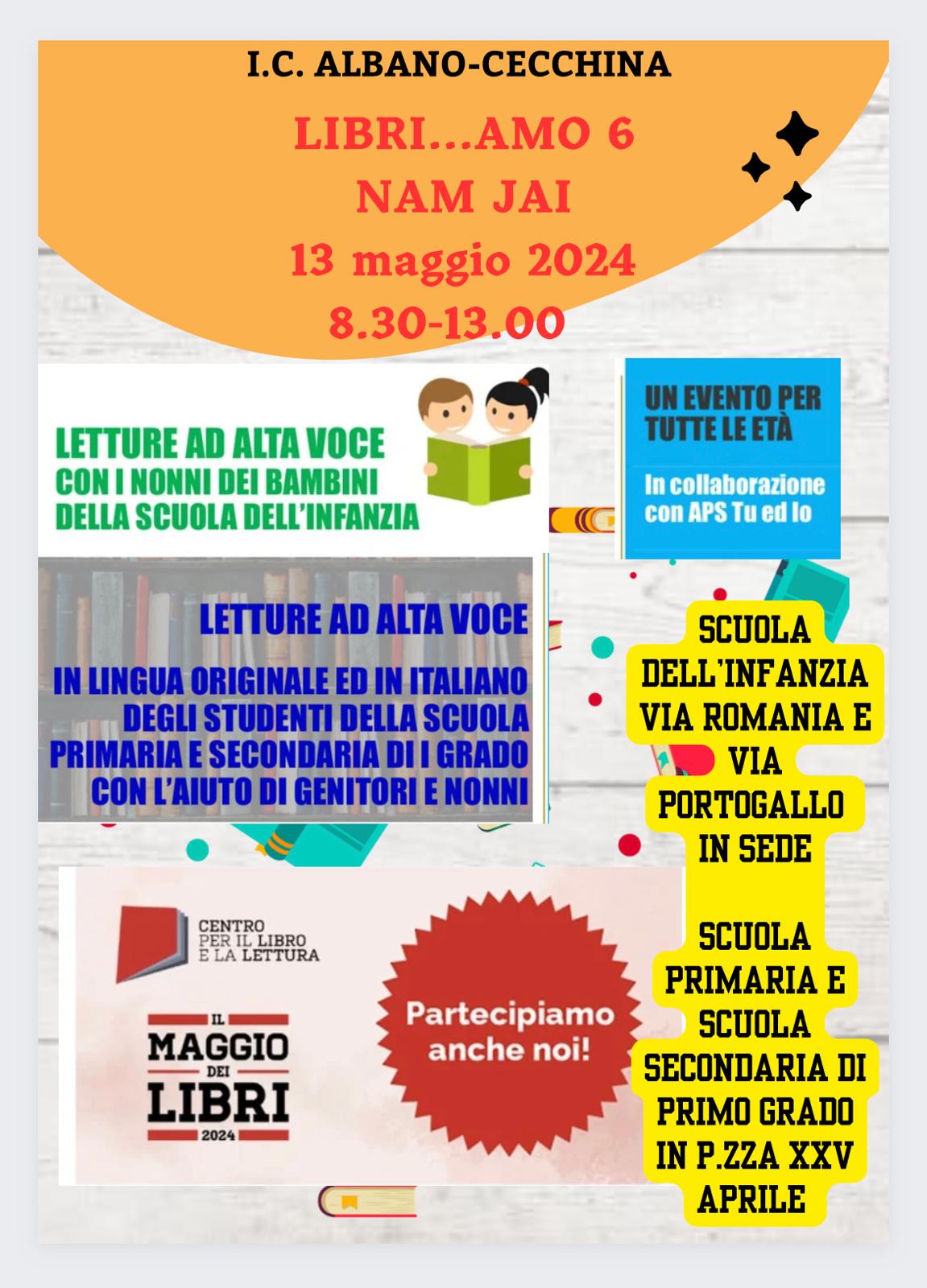 Nam Jai è un'iniziativa di intercultura che si terrà il 13 maggio promossa dal nostro Istituto comprensivo in collaborazione con l'APS TuedIO. Sarà un incontro di lettura ad alta voce collettiva, ognuno a turno nella propria lingua. Nam Jai infatti in Tailandese significa spirito di generosità, altruismo e cortesia, disponibilità verso gli amici e ospitalità nei confronti degli estranei. Nella scuola dell'Infanzia alcuni nonni dei bambini si recheranno in classe per leggere l'albo "Ti voglio bene anche se.." e "La regina dei baci" di Kristen Aetsenn. Gli studenti della scuola Secondaria di Primo grado si recheranno a turno nella piazza antistante la scuola (piazza XXV aprile) per condividere per tutta la mattinata con la popolazione di Cecchina (frazione di Albano Laziale) letture ad alta voce in lingua originale (romeno, albanese, cinese, indiano, russo, ucraino, spagnolo, urdu) e traduzione italiana testi da loro scelti: favole, racconti, poesie della tradizione di questi paesi. Ad aiutare nella lettura in lingua originale interverranno anche genitori e nonni.