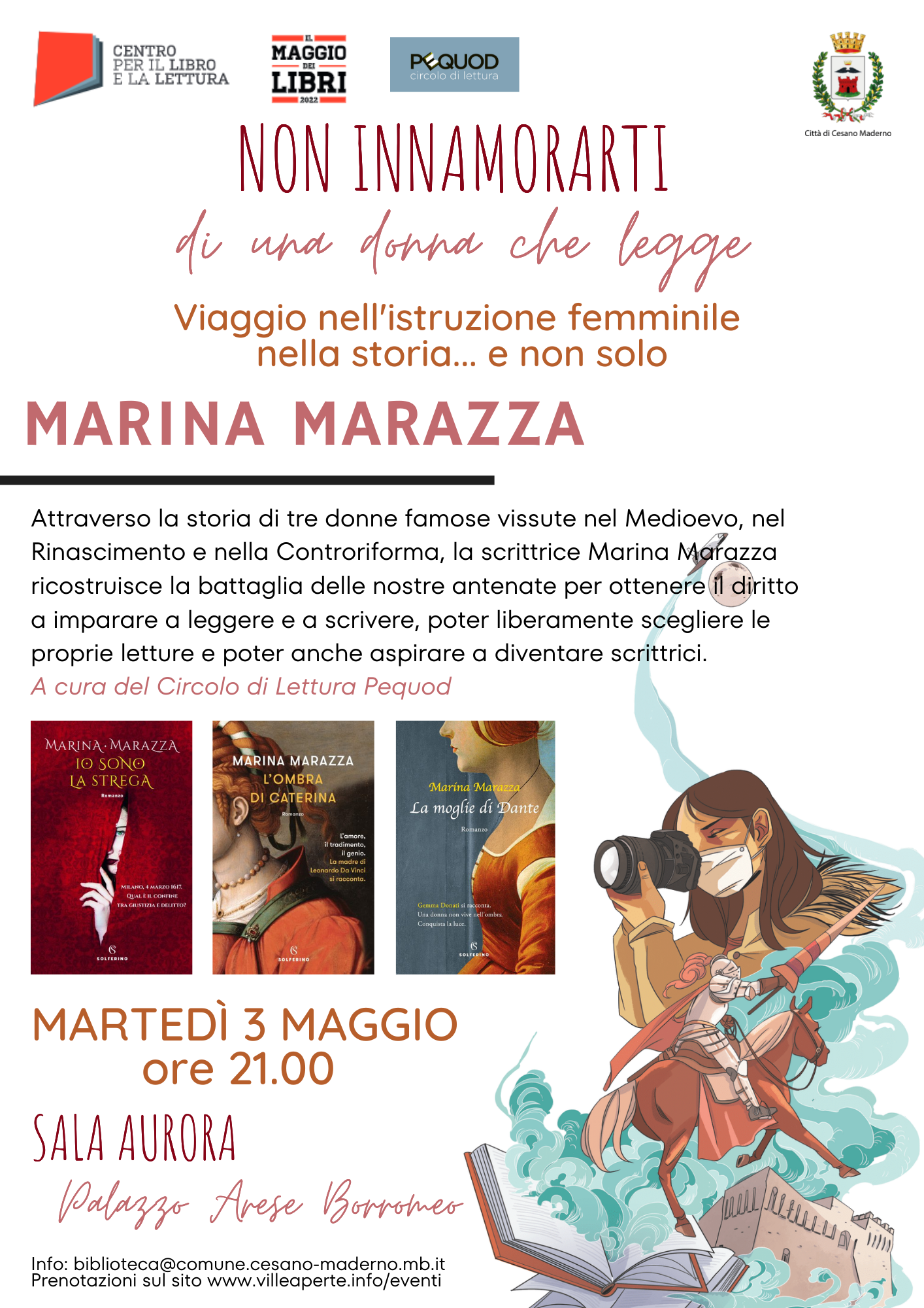 Attraverso la storia di tre donne famose vissute rispettivamente nel Medioevo (Gemma Donati, moglie di Dante Alighieri), nel Rinascimento (la madre di Leonardo da Vinci) e nella Controriforma (Caterina da Broni, la Strega di Milano), raccontate nei suoi non fiction novel La moglie di Dante (Solferino 2021), L???ombra di Caterina (Solferino 2019) e Io sono la strega (Solferino 2020), la scrittrice Marina Marazza, finalista al Bancarella, ricostruisce la battaglia delle nostre antenate per ottenere il diritto a imparare a leggere e a scrivere, poter liberamente scegliere le proprie letture e poter anche aspirare a diventare scrittrici.