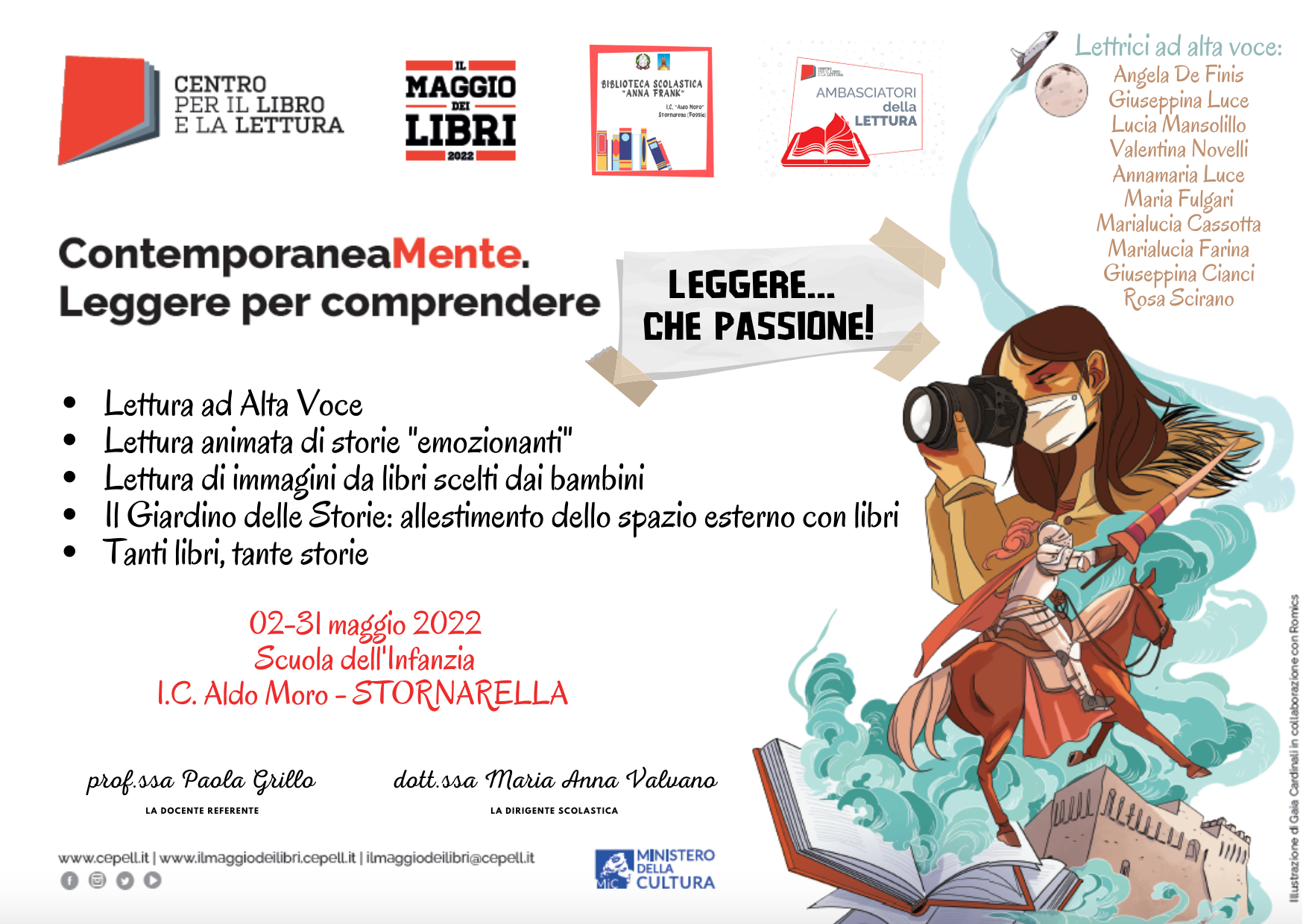 Per tutto il mese di maggio in tutte le classi del nostro IC saranno portati a termine i percorsi di lettura programmati ed implementati nell???ambito del Progetto Lettura d???Istituto ???Da Libriamoci al Maggio dei Libri???: che siano interni alle singole classi o in gemellaggio con altre, orizzontali o verticali, in continuit?? tra i due Ordini di Scuola, coerenti con Progetti PON curricolari e/o extracurricolari (LAV, Up-cycling,???), connessi ad eventi (Covid, guerra in Ucraina,???) o esperienze (gite, visite guidate,???) e/o ricorrenze/festivit??, afferenti agli obiettivi trasversali dell???Agenda 2030 e/o di Educazione Civica, tutte le attivit?? realizzate potranno trovare spazio all???interno di uno dei tre filoni proposti, proprio perch?? leggere in modo critico, diversificato ed approfondito ?? l???unico modo per tentare realmente di comprendere il passato, vivere consapevolmente il presente ed immaginare un futuro possibile. I singoli percorsi attuati saranno poi documentati e registrati, tramite apposito Modulo di Google che sar?? a breve disponibile nell???aula virtuale predisposta ad inizio d???anno. Nello stesso spazio virtuale, al quale tutti i docenti coinvolti in attivit?? di lettura-continuit?? sono stati invitati, saranno disponibili ulteriori informazioni e sar?? possibile condividere le iniziative, i testi utilizzati, il materiale prodotto (foto, documenti, libri digitali, leporelli, fanzine, video???), che servir?? a documentare il lavoro svolto, in modo anche da pubblicizzare opportunamente il tutto e dare a tutte le iniziative la giusta importanza e visibilit?? (come gi?? fatto con Libriamoci-#ioleggoperch??, inserite nei video realizzati per l???Open Day del nostro IC).