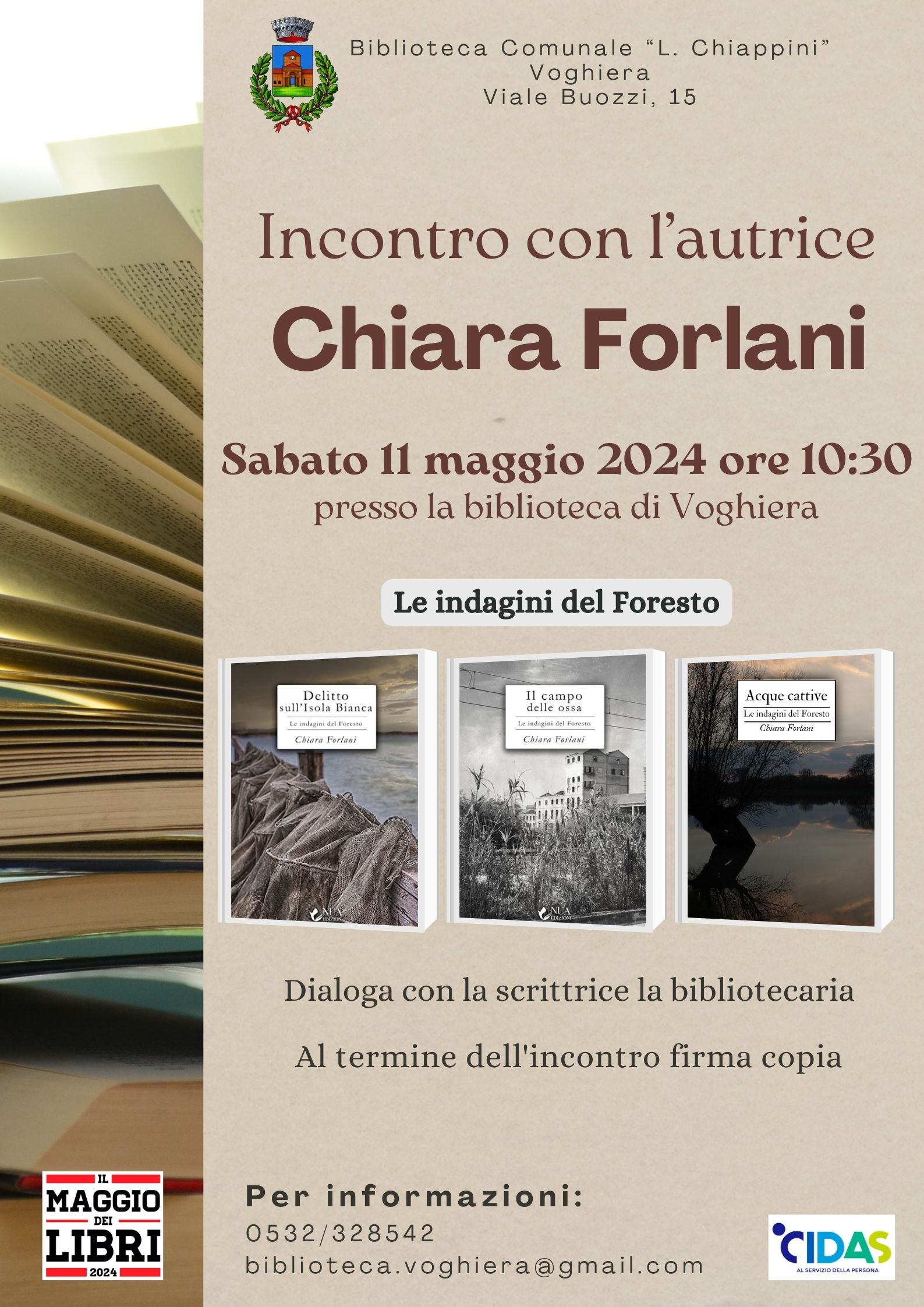 Incontro con l'autrice e presentazione dei suoi romanzi per le indagini del Foresto: Delitto sull'Isola Bianca, Il campo delle ossa, Acque cattive. Dialoga con l'autrice la bibliotecaria Giulia Aguzzoni. Al termine firmacopie.