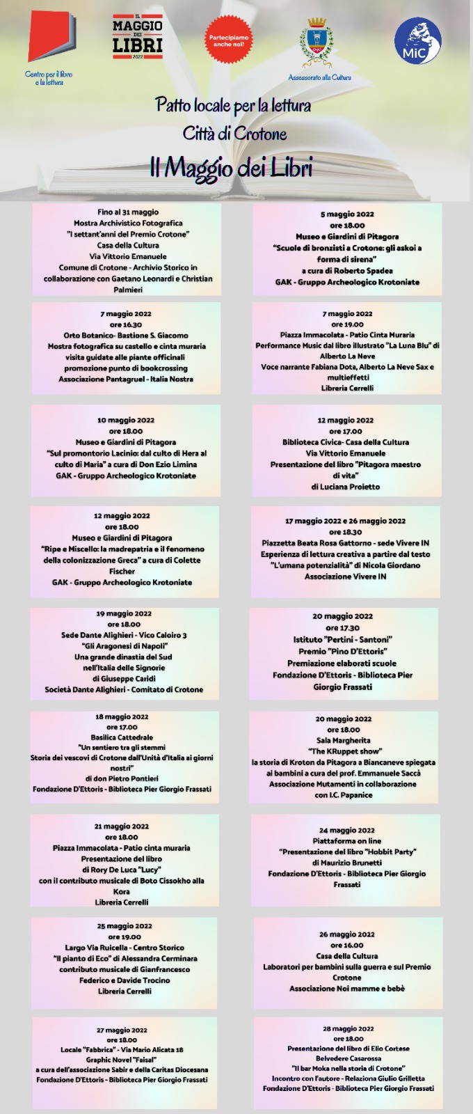 La biblioteca civica A. Lucifero/Comune di Crotone, in qualit?? di Capofila del Patto locale per la lettura Citt?? di Crotone, presenta il calendario di iniziative per il Maggio dei libri 2022, ideato grazie alla collaborazione con i partner del Patto. Il calendario propone circa 20 appuntamenti, a ingresso gratuito, che si articoleranno lungo tutto il mese di maggio e che troveranno realizzazione in angoli diversi della citt??, dal centro alla periferia, con un riguardo alla riscoperta della citt?? vecchia e ad alcune dei suoi angoli pi?? nascosti. Diverse le tipologie degli eventi: dai seminari di approfondimento sulla storia e sull???archeologia della citt?? magnogreca di Kroton, ai laboratori e agli spettacoli per bambini, dagli incontri con gli autori con performance musicale e aperitivo, alle attivit?? di lettura creativa, oltre ad una mostra bibliografico-archivistica e fotografica che celebra i 70 anni dello storico Premio letterario Crotone, che vide la presenza costante in citt?? di autori come Pasolini, Moravia, Sciascia.
