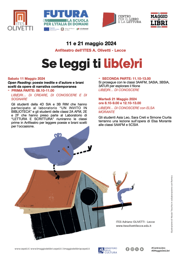 L'ITES Olivetti di Lecce realizza un percorso articolato in due eventi in cui gli studenti che hanno partecipato a laboratori co-curricolari di "Lettura e scrittura creativa" e "Un invito in biblioteca", finanziati con il progetto PNRR "Alta frequenza all'Olivetti" per la prevenzione della dispersione scolastica, dialogheranno di poesia e libertà sulla scia dei tre filoni tematici dell'edizione 2024 de "Il Maggio dei libri".