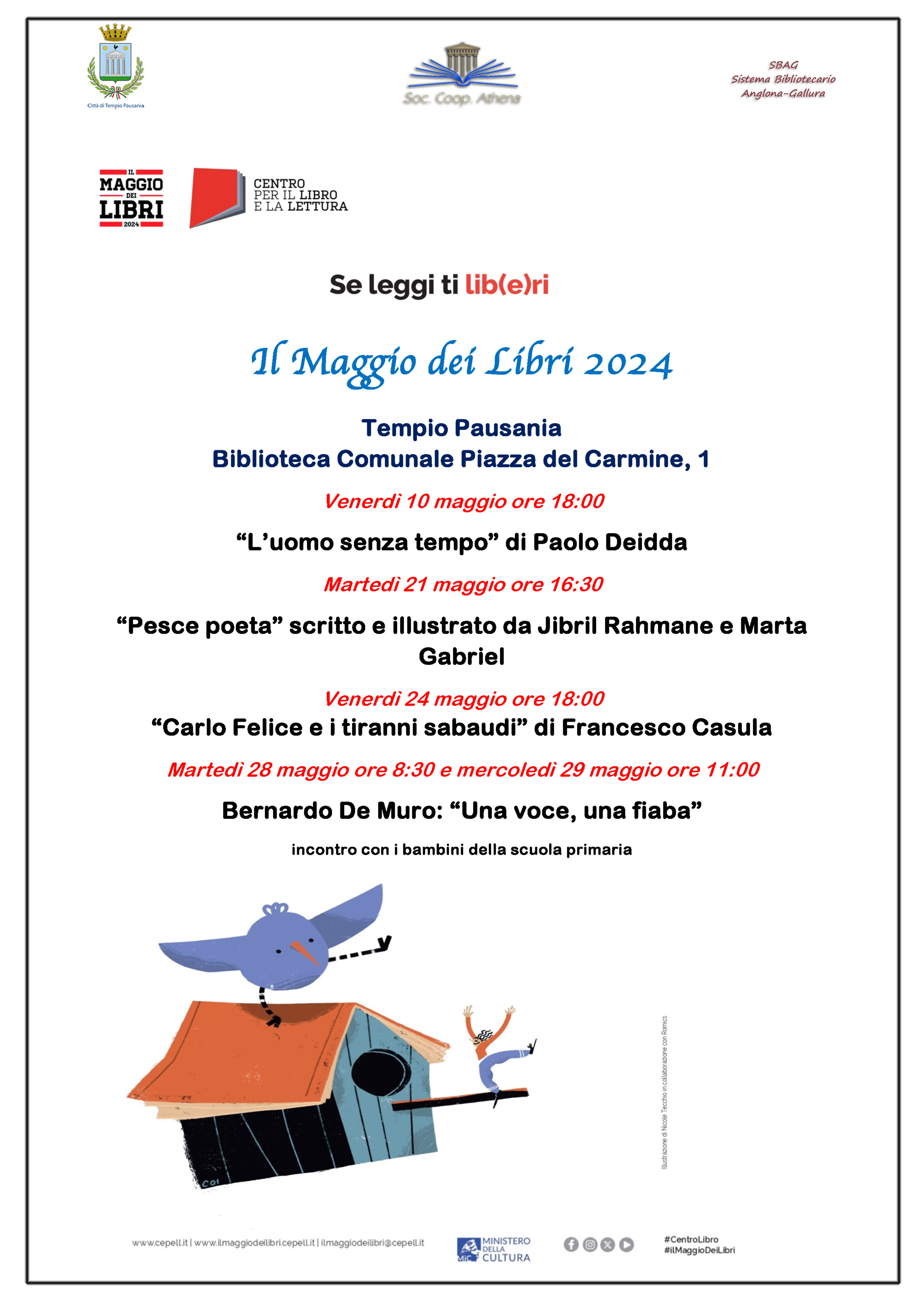 Calendario delle presentazioni di libri e incontri destinati agli adulti e ai bambini della scuola primaria in occasione della campagna nazionale "Il maggio dei libri 2024", dal titolo "Se leggi ti lib(e)ri". presso la biblioteca comunale di Tempio Pausania.