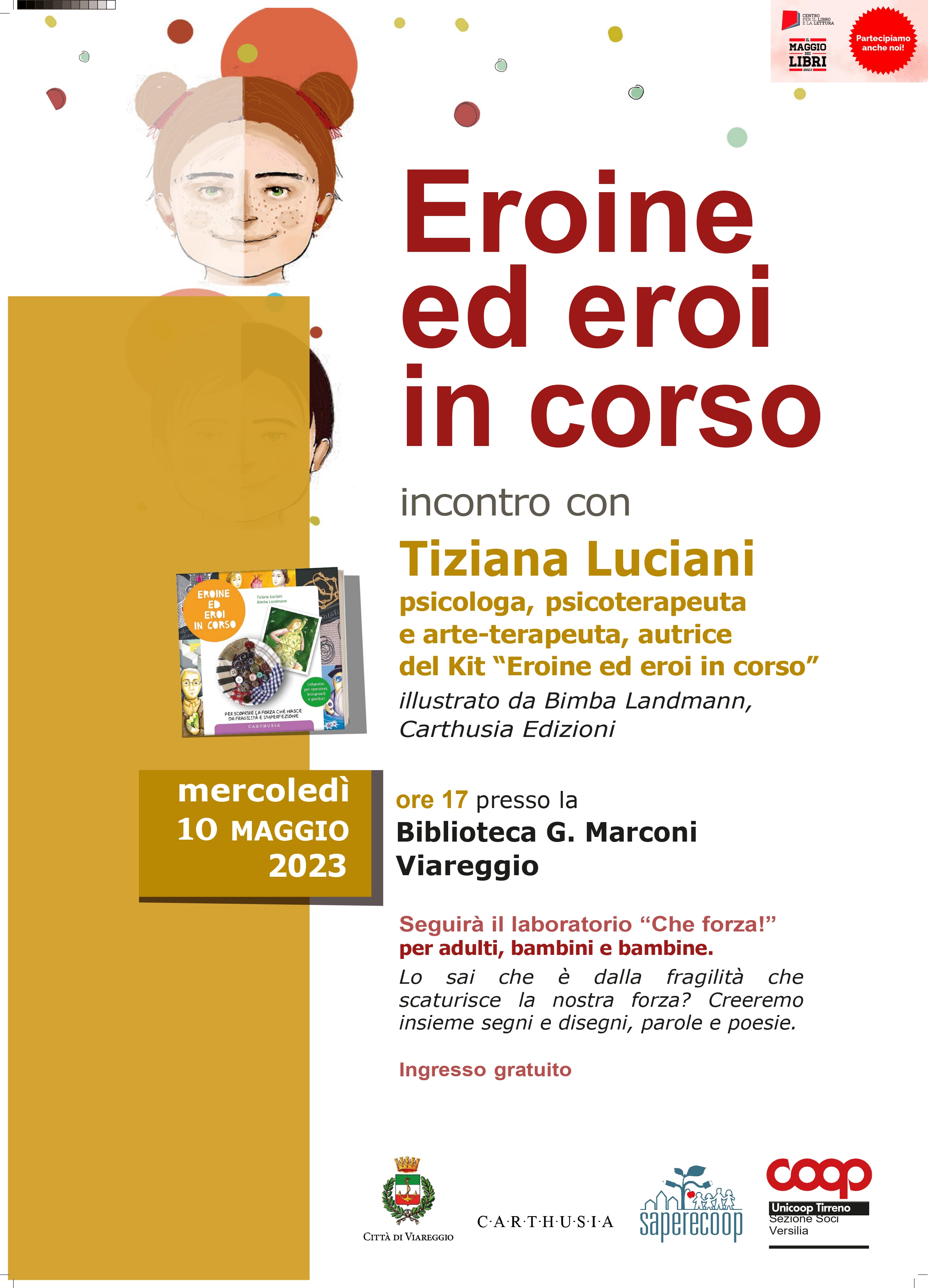 L'incontro con Tiziana Luciani, psicologa, psicoterapeuta e arte-terapeuta, autrice del kit "Eroine ed eroi in corso". Il cofanetto contiene un albo illustrato per bambine e bambini, ragazze e ragazzi e una guida per insegnanti, educatori, operatori e genitori. L'albo racconta le vite di eroine e eroi del passato, del presente e dell'immaginazione: tutti legati dal filo rosso dell'imperfezione che rafforza. Nella guida è possibile seguire passo per passo le tappe del "percorso eroico" attraverso esperienze vissute, riflessioni e attività di laboratorio da leggere e poi rivivere in famiglia, a scuola e nel sociale. Seguirà il laboratorio "Che forza!" per adulti, bambine e bambini. È un progetto #LaBibliotecaFuoridiSé.