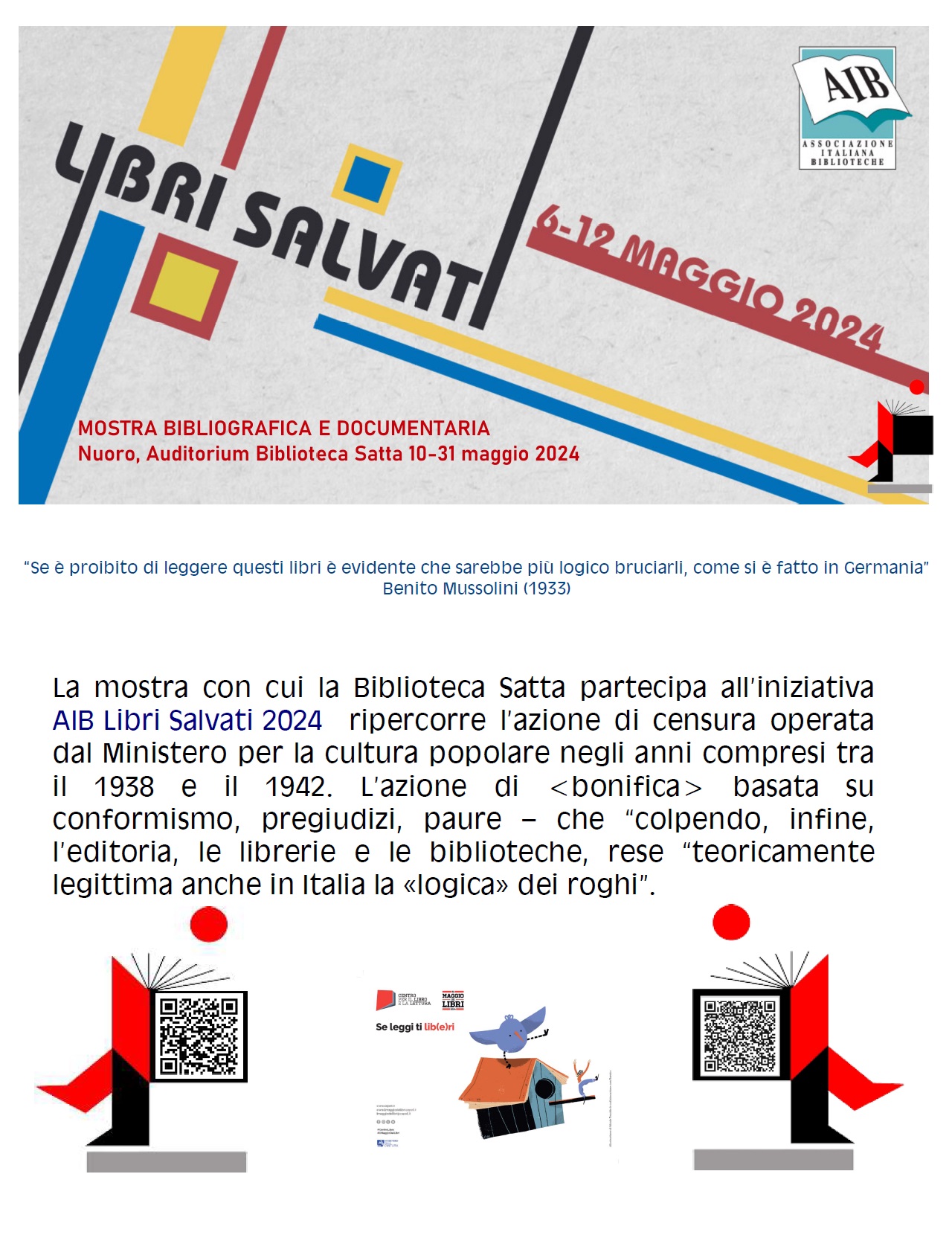 Il Consorzio per la pubblica lettura S. Satta aderisce all’iniziativa AIB Libri Salvati 2024 con una mostra bibliografica e documentaria che ripercorre l’azione di censura operata dal Ministero per la cultura popolare negli anni compresi tra il 1938 e il 1942; un’azione di “bonifica” basata su conformismo, pregiudizi, paure – che colpendo, infine, l’editoria, le librerie e le biblioteche, rese teoricamente legittima anche in Italia la “logica” dei roghi (Simon Levis Sullam, 2023).