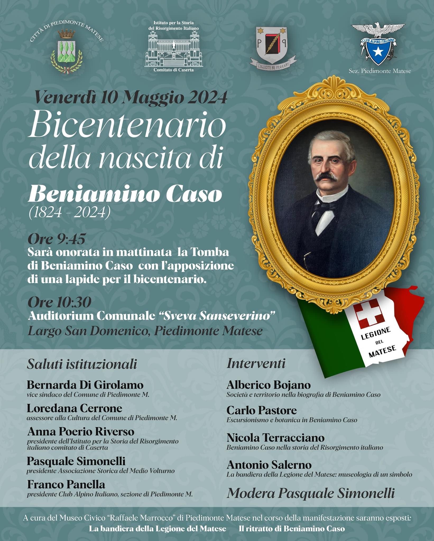 L'importante giornata commemorativa nasce per ricordare e trasmettere alle future generazioni la figura di Beniamino Caso (1824-2024) nel bicentenario della nascita. La figura più importante della ricca storia culturale, civile, politica del distretto storico di Piedimonte Matese (per secoli chiamata d’Alife) di rilievo non solo provinciale, ma nazionale, per il contributo prezioso e importante da lui dato alla nascita dell’Italia una, libera, moderna, nei cruciali anni 1860-1861, avendo egli promosso a Piedimonte nell’agosto 1860 la garibaldina ‘Legione del Matese’ (che giunse ad avere fino a 435 componenti, quasi la metà dei Mille, partecipando alla decisiva Battaglia del Volturno, eletto deputato più rappresentativo della grande Terra di Lavoro nel primo Parlamento Nazionale, che approvó il memorabile 17 marzo 1861 la nascita epocale a Torino (allora capitale) dell’Italia una, libera, moderna.