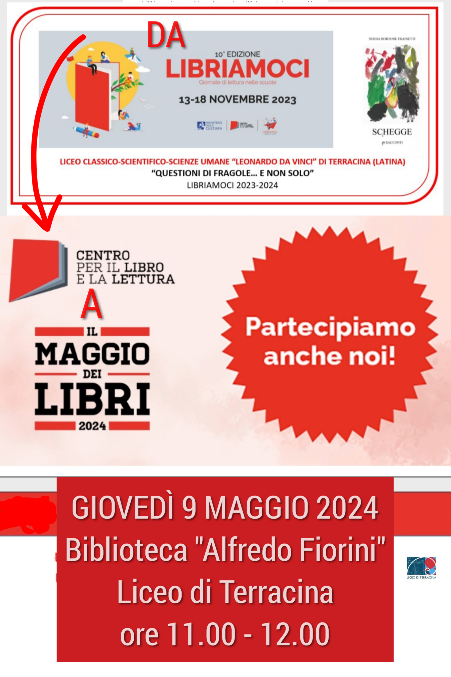 All’insegna dell’invito della X edizione di "Libriamoci 2023" a considerare “la lettura come espressione di libertà e il libro come chiave per ottenerla”, continuano gli appuntamenti di "Libriamoci a scuola", iniziati nella settimana dal 13 al 18 novembre 2023, con i ragazzi delle classi terze del Liceo Classico-Scientifico-Scienze Umane “Leonardo da Vinci” di Terracina (Latina). In occasione de "Il Maggio dei Libri 2024" (con "Questioni di fragole... e non solo - da Libriamoci al Maggio del Libri), infatti, e precisamente il giorno giovedì 9 maggio 2024, si proverà a coinvolgere attivamente, presso la biblioteca "Alfredo Fiorini" dell'Istituto, sede del Progetto, gli alunni delle classi seconde dell'indirizzo classico, attraverso la prosecuzione della amichevole conversazione con l’autrice del libro "Schegge", Nisida Bortone Frainetti, ex docente di Lingua e Letteratura Inglese del Liceo, nelle questioni di più cogente attualità e di attenzione improcrastinabile, specialmente negli ultimi tempi.