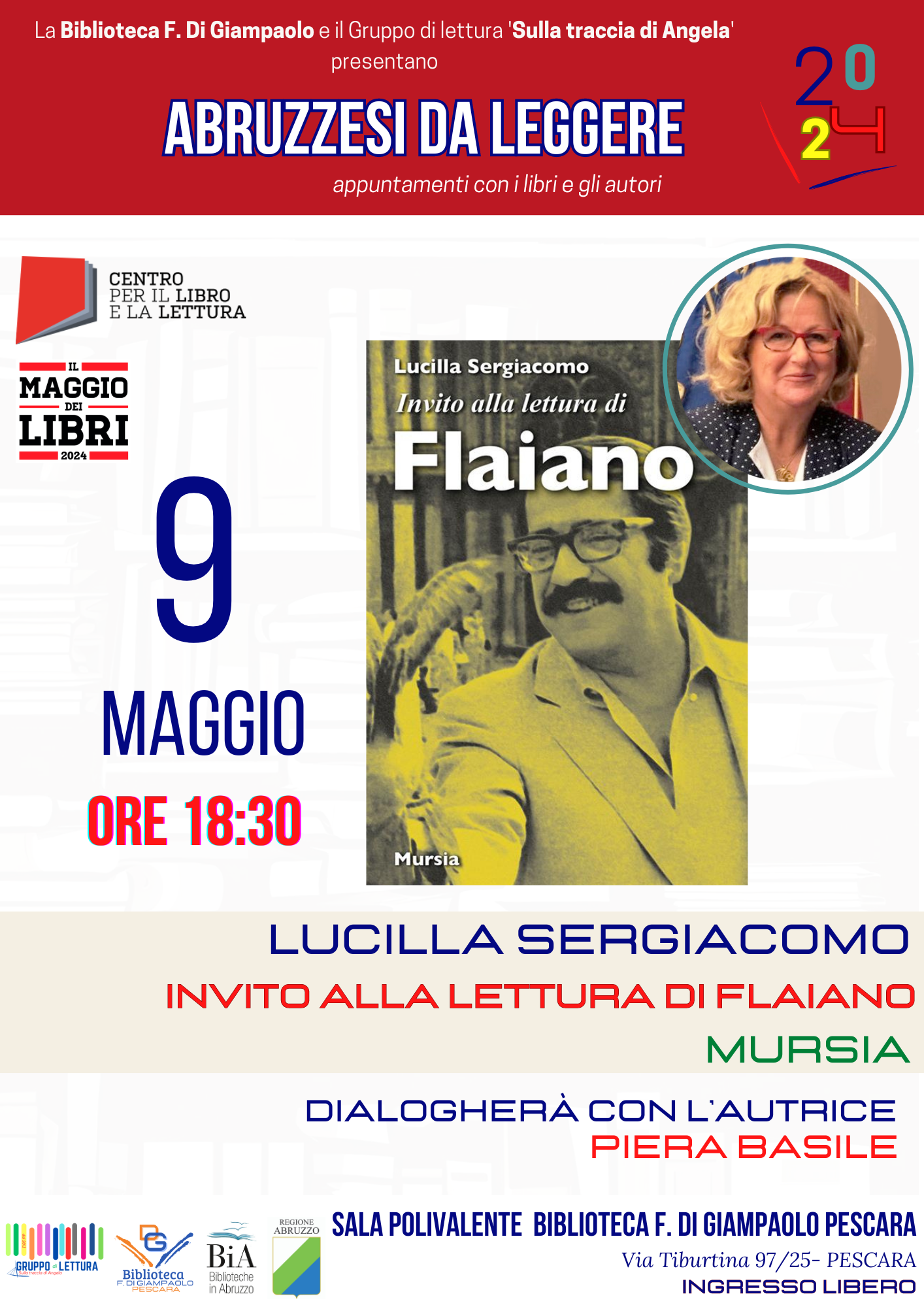 Nell'ambito della rassegna "Abruzzesi da leggere: appuntamenti con i libri e gli autori" il 9 maggio alla Biblioteca "F. Di Giampaolo" ci sarà Lucilla Sergiacomo a dialogare del suo libro "Invito alla lettura di Flaiano" con Piera Basile, del Gruppo di lettura Sulla traccia di Angela.