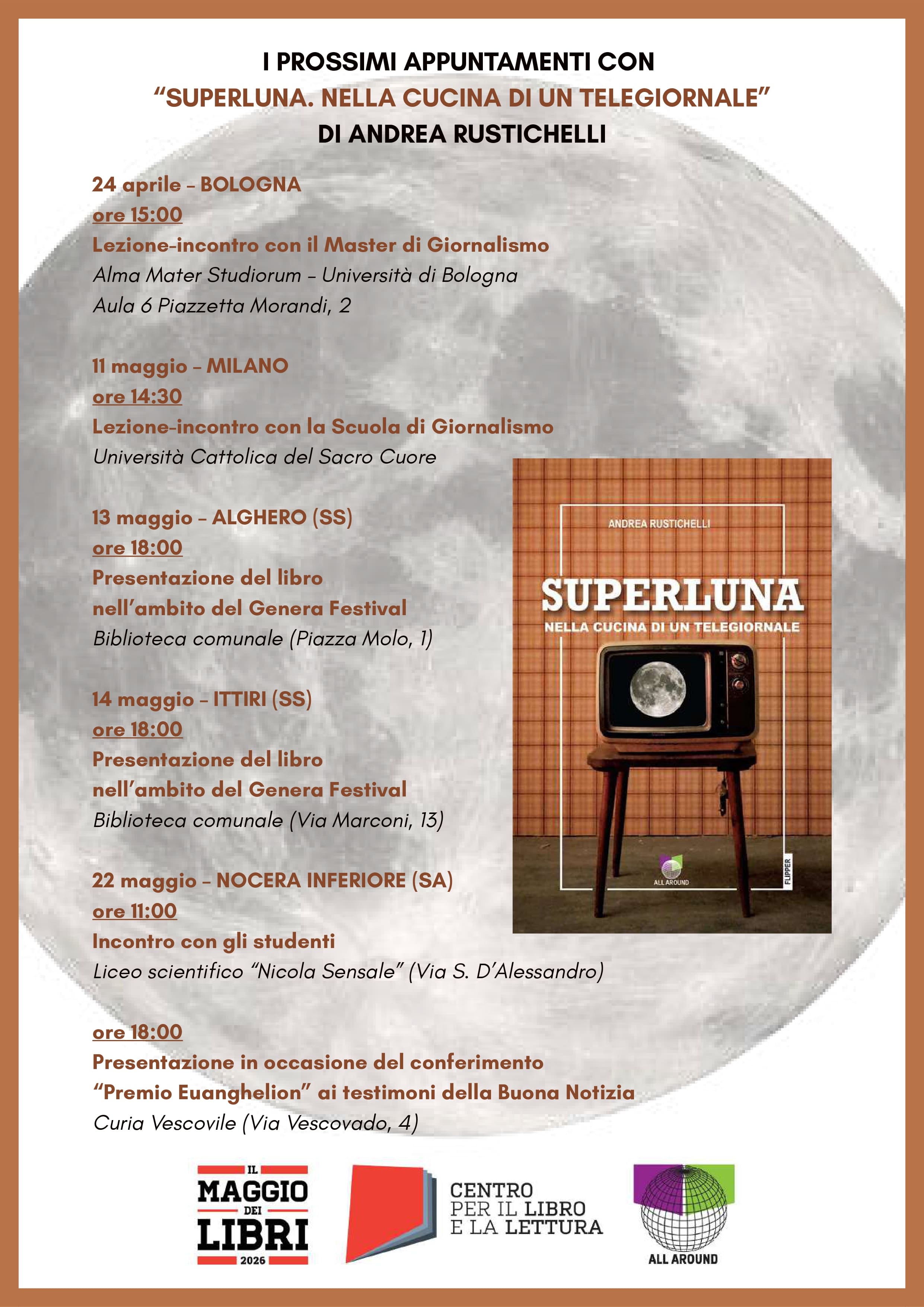 Quest'anno i nove appuntamenti si svolgeranno per la maggior parte allo Zambra ma alcuni si spostano all'interno della Libreria Moderna per creare anche una sporta di "itineranza" che ci auguriamo nei prossimi anni vada crescendo. Inoltre quest'anno la consueta rassegna di presentazioni sarà arricchita dalla musica in quanto, prima di ogni incontro, sarà possibile suonare un pianoforte messo a disposizione gratuitamente da un imprenditore locale e sarà lanciata una call per giovani pianisti, e avremo anche una mostra di opere di un artista locale. Ogni anno cerchiamo sempre più collaborazioni al fine di creare attorno al "Maggio dei Libri" una forte curiosità e diversità per dare più luce possibile all'incontro intorno alle storie. In ogni incontro a leggere le pagine scelte da autori e moderatori saranno attori con i quali collaboriamo e giovani allievi della scuola del luogo.