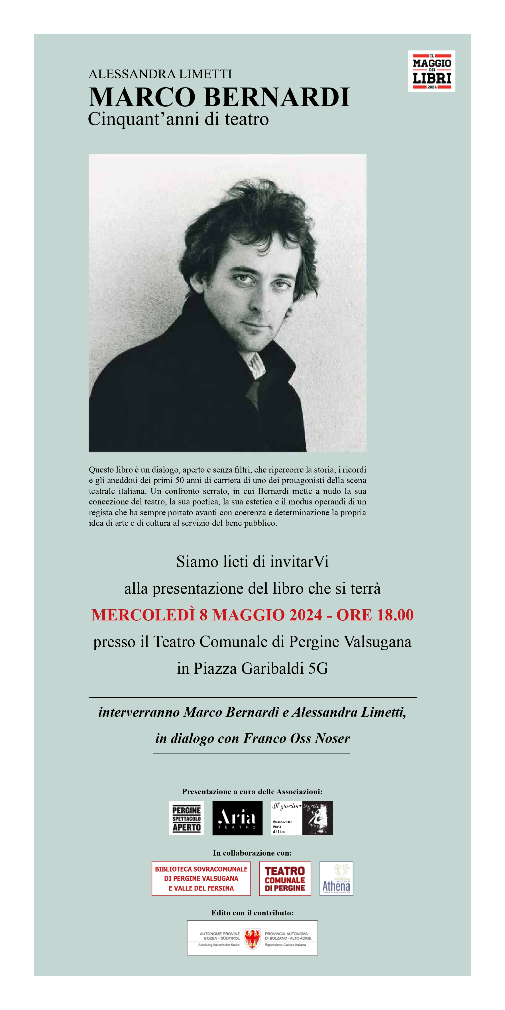 Mercoledì 8 maggio alle h. 18.00, il palcoscenico del Teatro Comunale di Pergine Valsugana ospiterà la presentazione del libro “Marco Bernardi – 50 anni di Teatro”,
