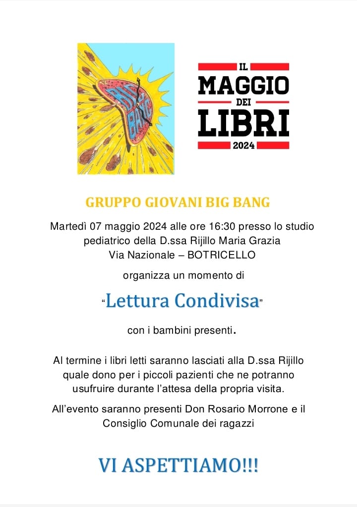 Letture condivise con bambini in uno studio pediatrico del nostro paese ed installazione di una bacheca, nella sala d'attesa, in cui lasciare i libri letti, quale opportunità di lettura per i piccoli pazienti che attenderanno la loro visita.