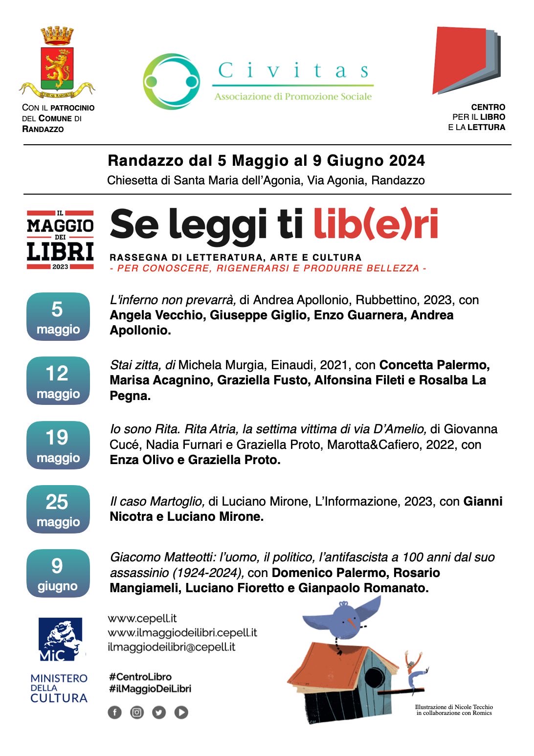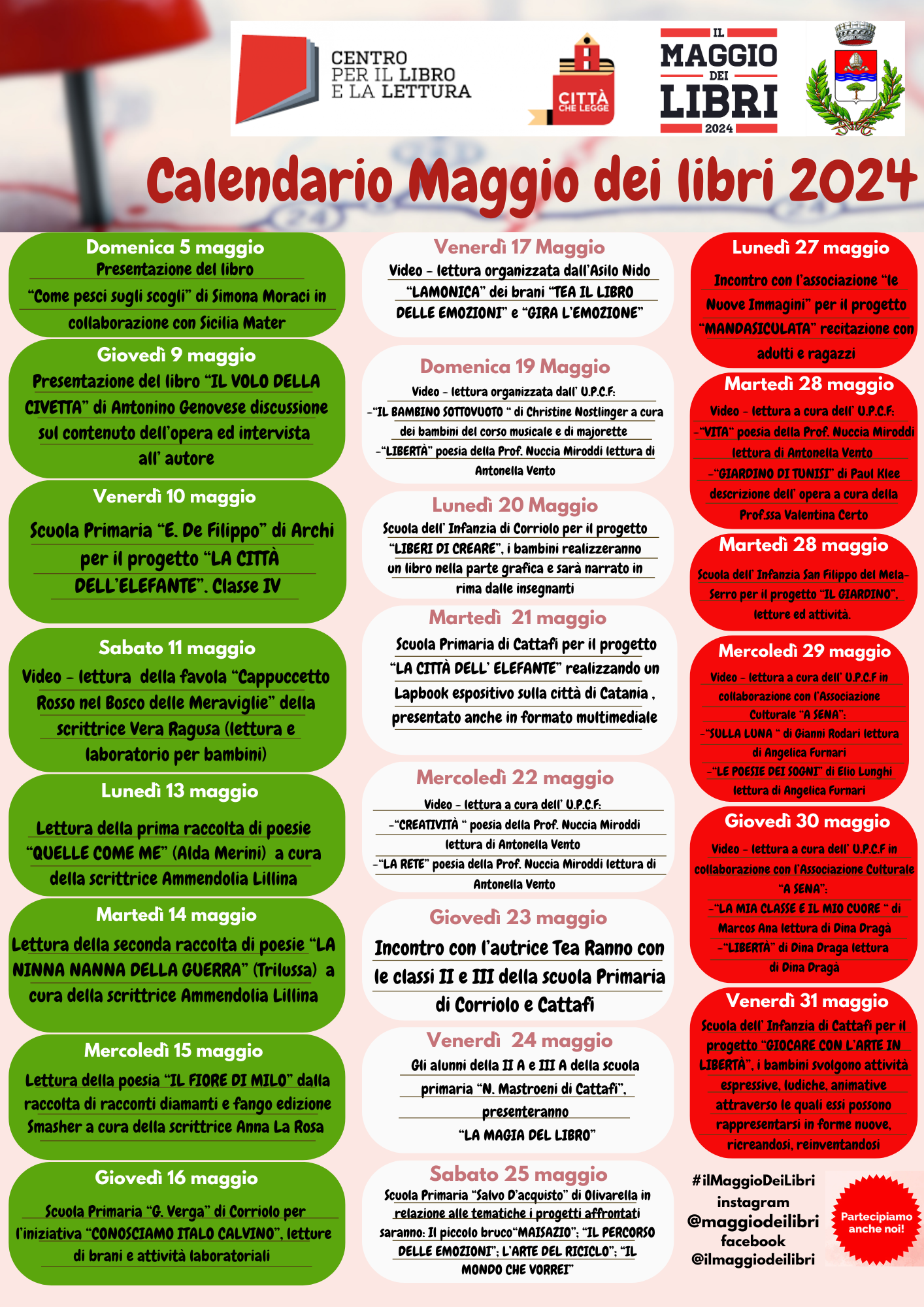 Il maggio dei libri del Comune di San Filippo del Mela, si svolgerà dal 5 maggio al 31 maggio 2024. Il ricco programma si avvale di numerose partecipazioni e collaborazioni. Le iniziative, vedono il coinvolgimento di associazioni, scuole, soggetti pubblici e privati. Gli eventi proposti si ispirano al tema "Se leggi ti liberi" avvalendosi di diverse forme comunicative, e precisamente: presentazione di libri, letture di brani, attività laboratoriali, video-letture, e attività espressive, ludiche, animative. Le iniziative vogliono favorire e stimolare l'abitudine alla lettura, considerata elemento chiave della crescita personale, sociale e culturale. Il Comune di San Filippo del Mela ha inteso rivolgere particolare attenzione ai nuovi utenti che per vari motivi frequentano poco la biblioteca. Gli eventi sono stati concepiti per coinvolgere persone di tutte le età con eventi esclusivi e aggregativi, che possono accogliere ogni membro della nostra comunità rendendo i libri accessibili a tutti, specialmente ai giovani. La maggior parte degli eventi sono video-letture condivise nella pagina ufficiale di Facebook del "Maggio dei Libri Comune di San Filippo del Mela".