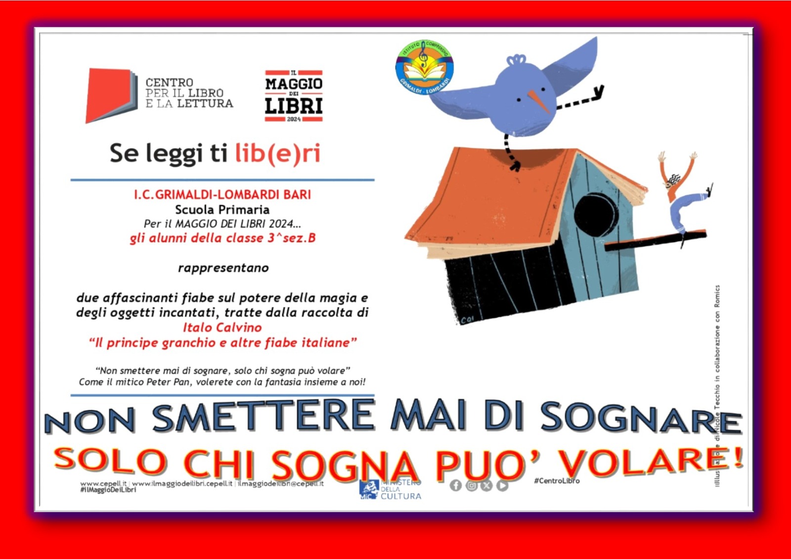 Più di un uccellino in volo, più di un equilibrista che sembra spiccare il volo, ci siamo sentiti liberi di esprimerci, di esprimere le nostre emozioni e opinioni, sorretti dagli autori e dalle loro opere, che ci hanno fatto vivere avventure da sogno. Ci siamo cimentati nella recitazione per entrare nel mondo incantato dei giocattoli dello Schiaccianoci di E.T.A. Hoffman, abbiamo “indossato i panni” degli antichi cantastorie per narrare, con il nostro Kamishibai, due affascinanti fiabe sul potere della magia e