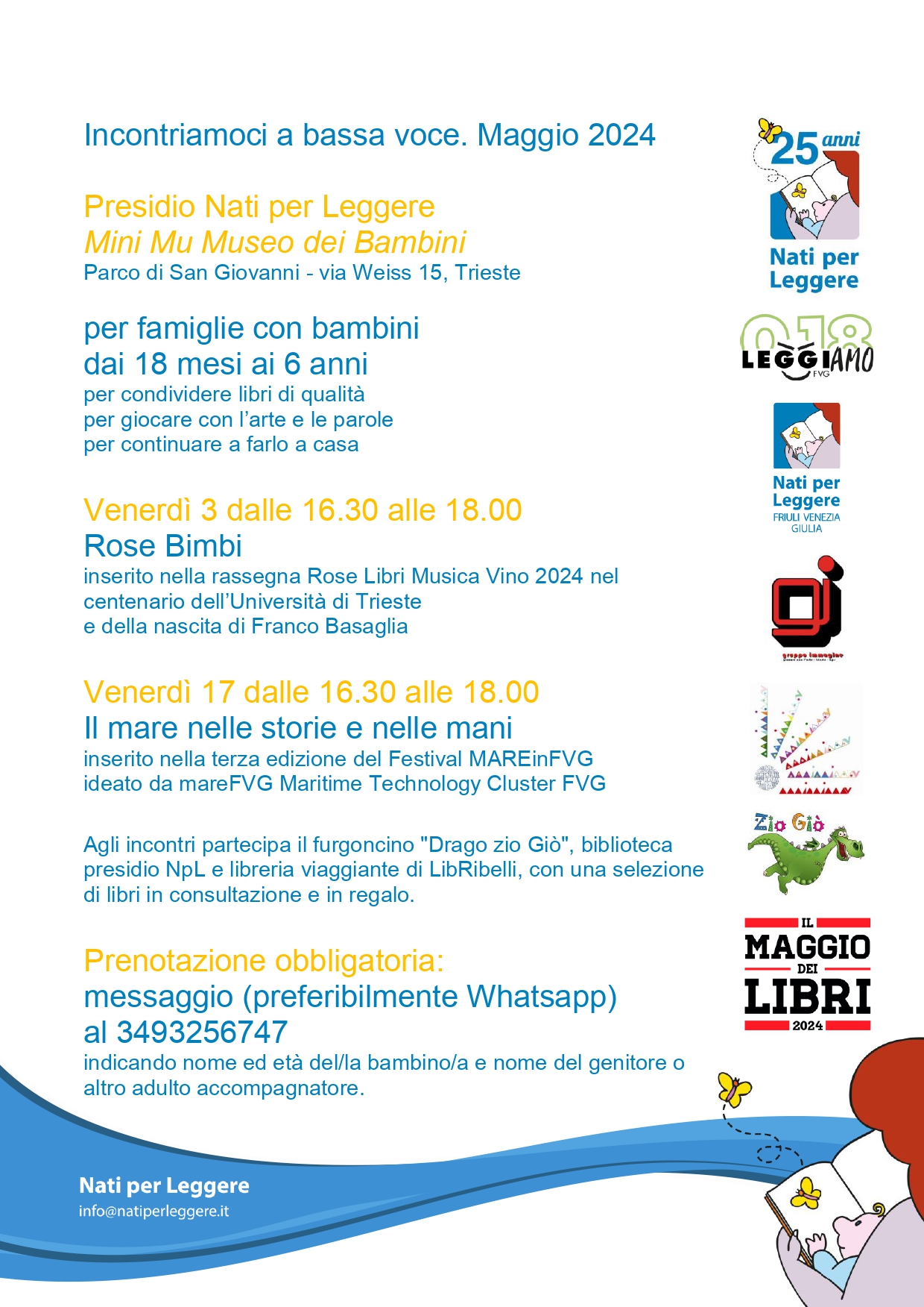 Venerdì 3 e 17 maggio, dalle 16.30 alle 18.00, al Mini Mu Museo dei Bambini (Parco di San Giovanni, via Weiss 15), incontri di lettura abbinati a mini laboratorio creativo, rivolti alle famiglie con bambini da 18 mesi a 6 anni.