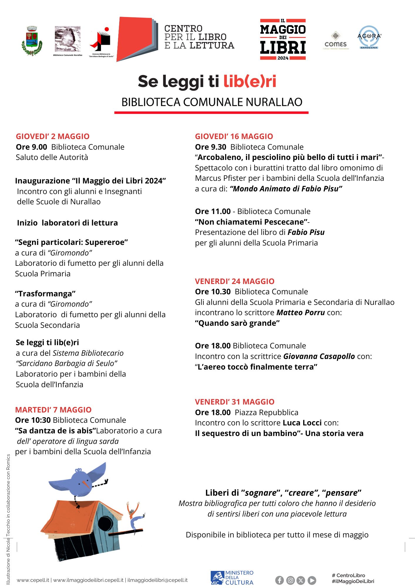 Per tutto il mese di Maggio la Biblioteca Comunale organizza una serie di eventi in biblioteca e in piazza per il piacere di condividere la lettura, coinvolgendo gli alunni delle scuole di Nurallao, famiglie e adulti con laboratori creativi e incontri con autori.