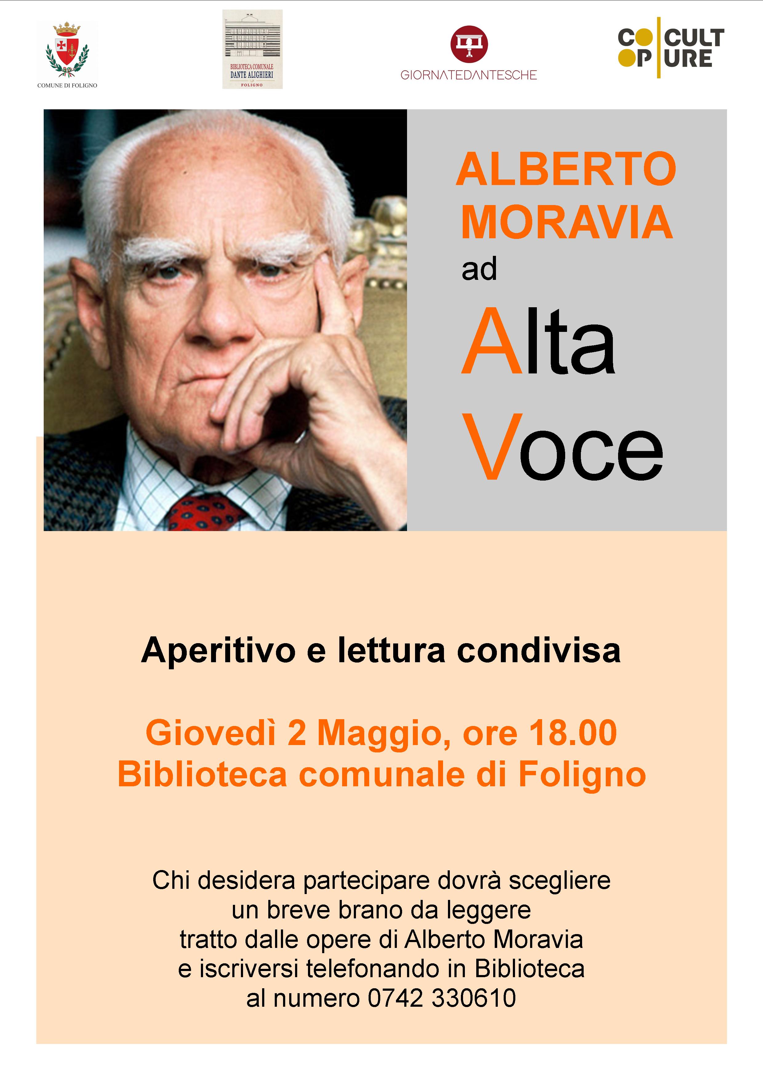 A seguito dell'incontro su Alberto Moravia, tenuto dal professor Simone Casini in occasione delle Giornate dantesche 2024, si rinnova l'appuntamento "Ad alta voce" in Biblioteca comunale, dedicato appunto allo scrittore Moravia. L'incontro si terrà giovedì 2 maggio alle ore 18, nella sala di lettura della Biblioteca centrale di Foligno in piazza del Grano.