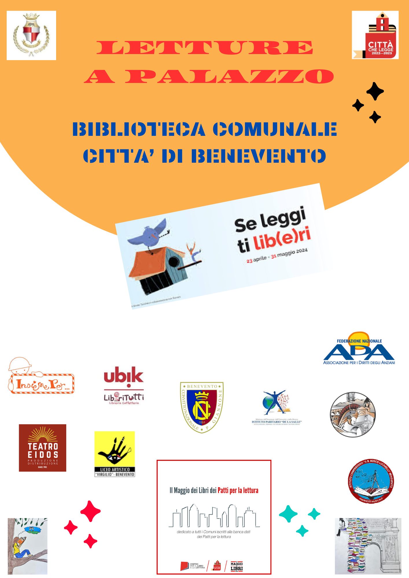 Con la rassegna letteraria "Letture a Palazzo, V ediz.", si vuole liberare la creatività in nome della lettura, cimentarsi nell’organizzazione di iniziative che promuovano la cultura in tutte le sue forme con una serie di eventi che si snoderanno nel mese di maggio p.v. presso Palazzo Paolo V, le scuole, le librerie aderenti al Patto locale, Teatro Comunale Vittorio Emmanuele, Hortus Conclusus e Villa dei Papi.