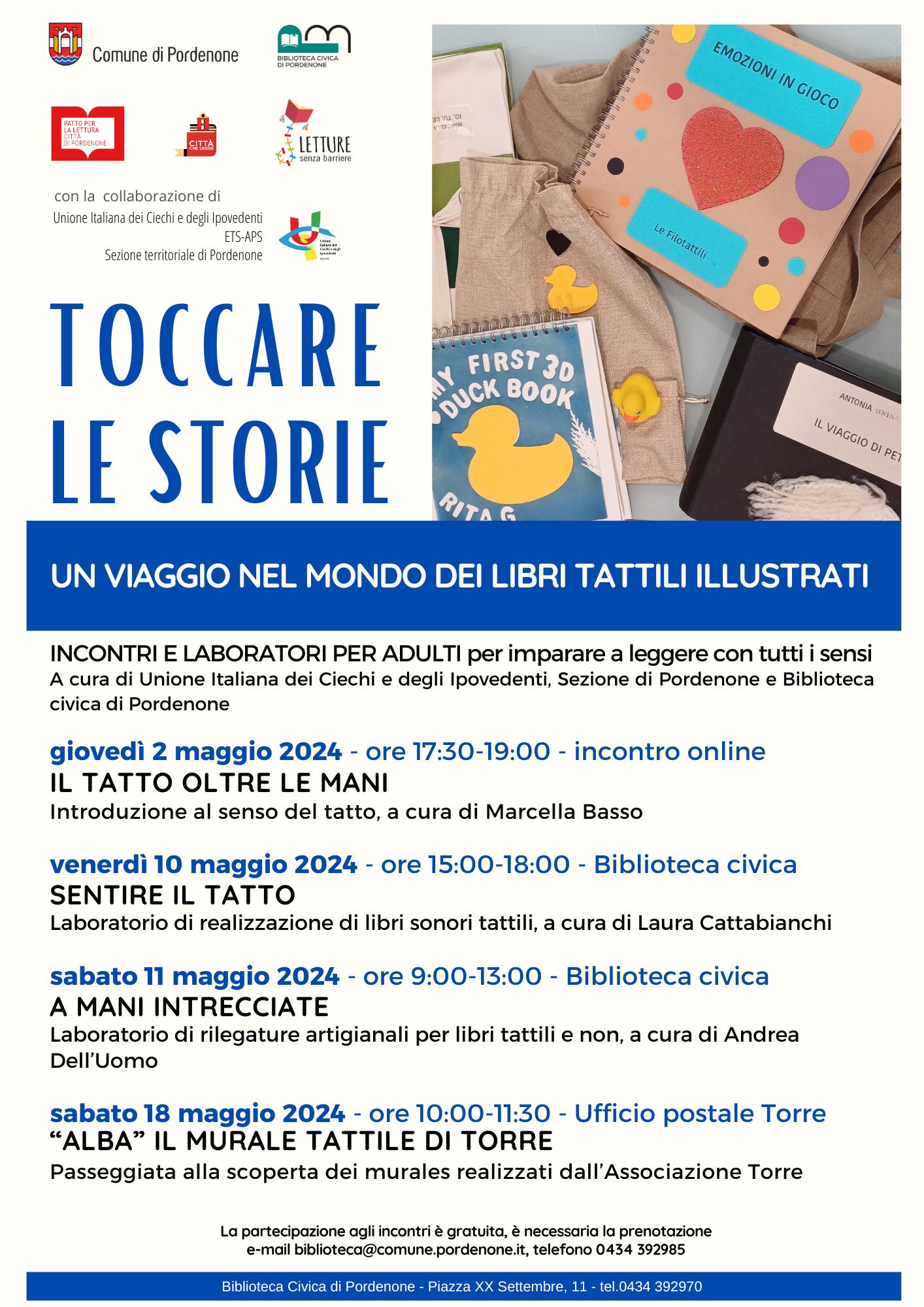 La Biblioteca civica di Pordenone in collaborazione con l'Unione Italiana dei ciechi e degli Ipovedenti di Pordenone propone un ciclo di incontri e laboratori sul tatto e i libri tattili, per proseguire il percorso di inclusione e accessibilità avviato con il progetto "Letture senza barriere".
