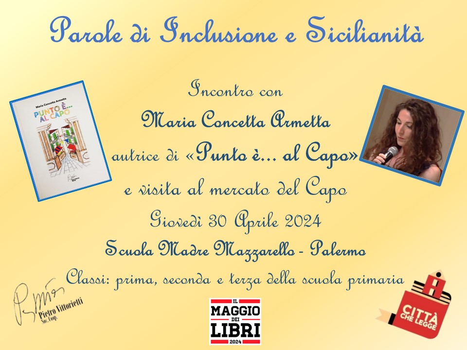 Le classi che hanno adottato I libri Armalilàndia, Armalicomio, leggendo leggende e Punto è... al Capo - Ed. Vittorietti incontreranno l'autrice M. Concetta Armetta per trattare tematiche sociali come l'atteggiamento mafioso, il cyberbullismo e l'immigrazione e la povertà educativa. L'autrice proporrà una lettura drammatizzata di un estratto dei testi e si lascerà coinvolgere in un'intervista a tutto tondo. In questo evento è prevista anche una visita per vicoli del Capo per scoprire i luoghi dove ha vissuto Punto, protagonista del libro Punto è... al Capo.