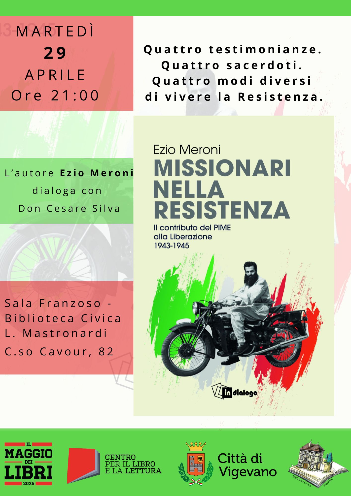Ezio Meroni, autore del libro, dialoga con don Cesare Silva e ci presentano un racconto storico sull’impegno di quattro sacerdoti del PIME che, durante la Seconda Guerra Mondiale, scelsero di partecipare attivamente alla Resistenza. Impediti dalla guerra di svolgere la loro missione all’estero, padre Ferruccio Corti, padre Lido Mencarini, padre Aristide Pirovano e padre Mario Limonta, si opposero al totalitarismo, non con violenza ma testimoniando la carità cristiana e aiutando prigionieri ed ebrei a sfuggire alla persecuzione nazifascista.
