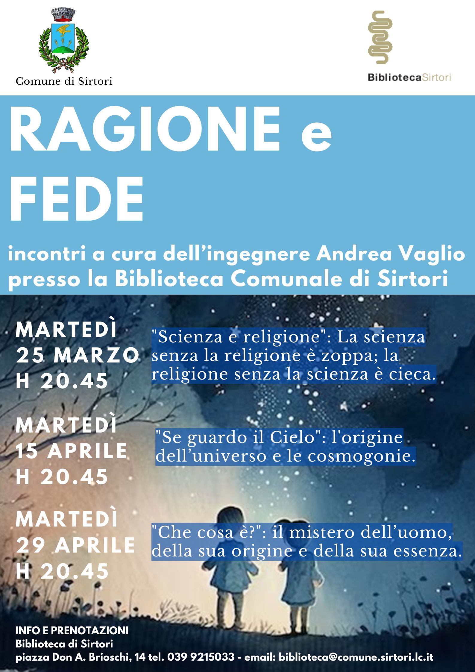 La biblioteca ha ospitato una stimolante rassegna di incontri a cura dell’ingegnere Andrea Vaglio, dedicata al confronto tra scienza e religione. Un’occasione preziosa per riflettere sui grandi interrogativi dell’esistenza: l’origine dell’universo, il mistero dell’essere umano e il rapporto tra fede e razionalità. Attraverso parole, immagini e riferimenti a pensatori come Einstein, gli incontri hanno guidato il pubblico in un percorso affascinante tra cosmologia, antropologia e filosofia, dove la curiosità scientifica si intreccia con la profondità spirituale.