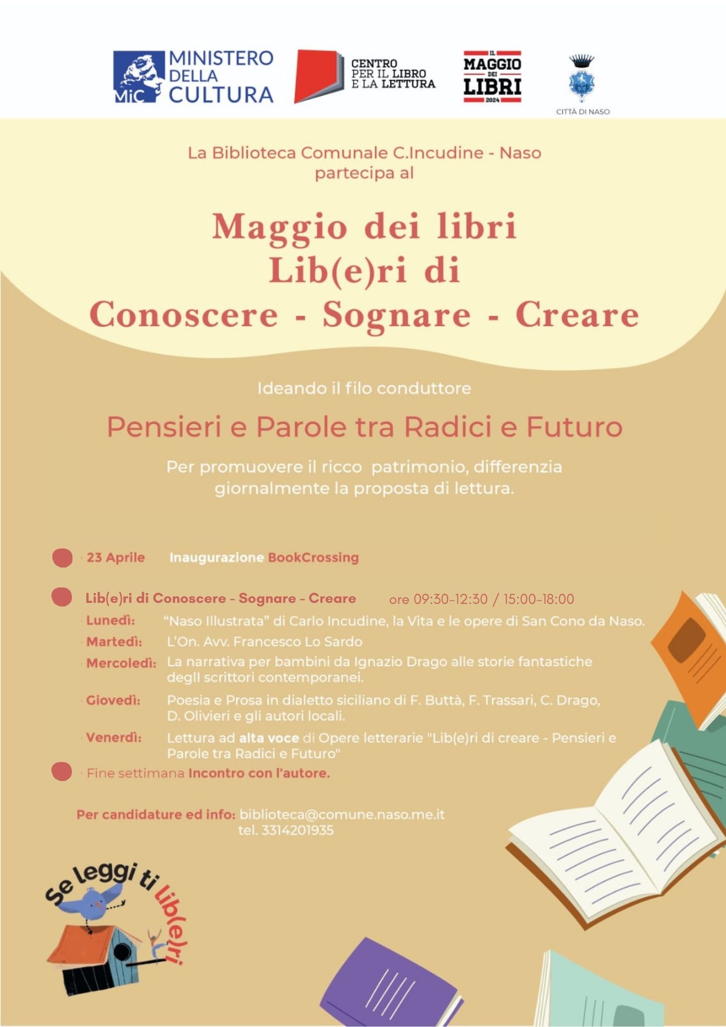 - Con Lib(e)ri di conoscere verranno considerati i testi e gli scritti anche in dialetto siciliano, che raccontano la tradizione e l’identità culturale di un popolo attraverso i saggi ed i personaggi che hanno dato i natali alla Città di Naso dal punto di vista socio-politico, economico, artistico, religioso. A corollario verranno esplorate le missive intercorse tra i nostri autori locali e Salvatore Quasimodo.