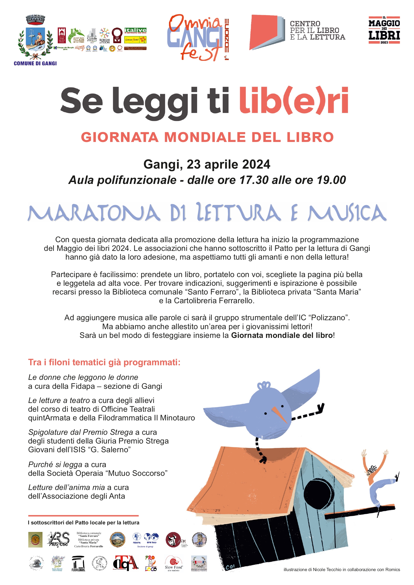 In occasione della Giornata mondiale del libro e del diritto d'autore, Bibliò partecipa a "Il Maggio dei libri 2024" con una Maratona di letture e racconti che coinvolgerà, per tutto il pomeriggio del 23 aprile, i bambini e i ragazzi in letture e racconti intorno al tema "Se leggi ti lib(e)ri".