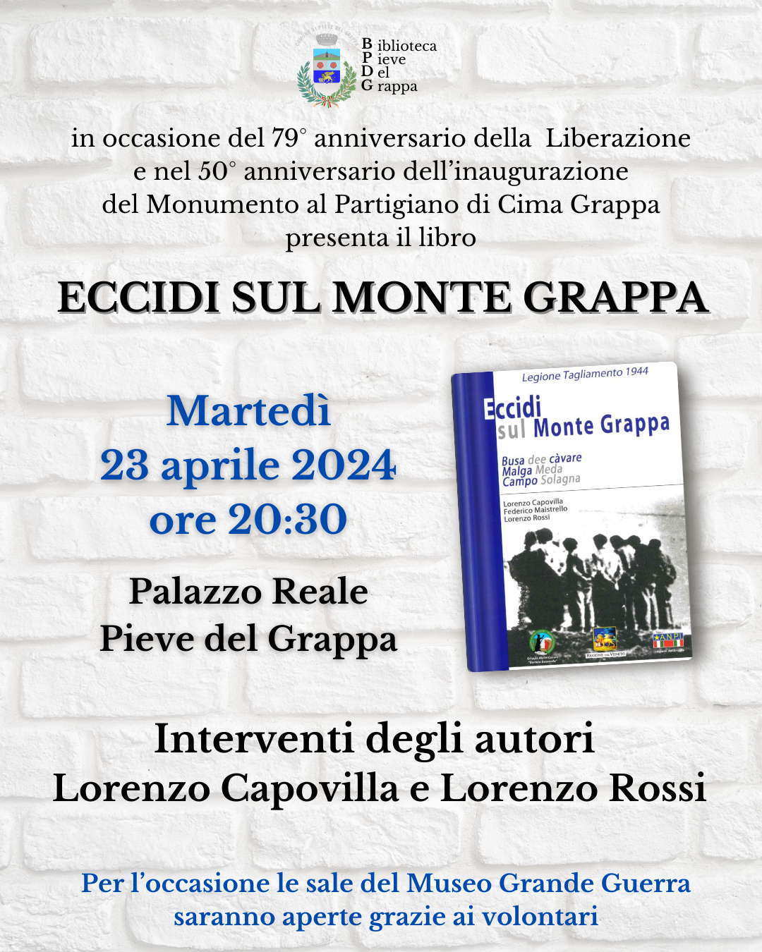 In occasione del 79° anniversario della Liberazione e nel 50° anniversario dell’inaugurazione del Monumento al Partigiano di Cima Grappa presentano il libro Eccidi sul Monte Grappa gli autori Lorenzo Capovilla e Lorenzo Rossi.