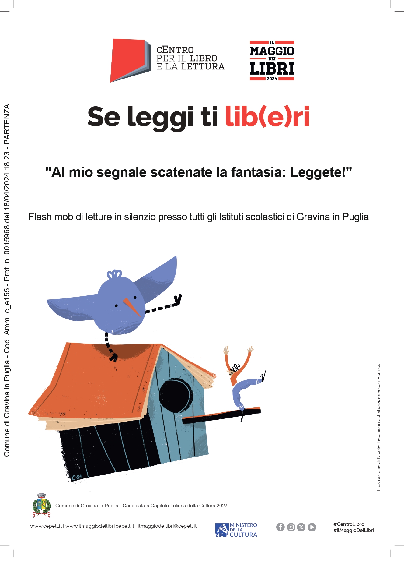Il 23 aprile, Giornata mondiale del libro e del diritto d'autore, nota anche come Giornata del libro e delle rose, evento organizzato dall'UNESCO il 23 aprile di ogni anno, per promuovere la lettura, la pubblicazione dei libri e la protezione della proprietà intellettuale attraverso il copyright, alle ore 9.00 in tutte le scuole di Gravina in Puglia, al suono della campanella, si interromperanno tutte le attività e tutti: dirigenti, collaboratori, docenti e studenti, prenderanno ciascuno il proprio libro e leggeranno, in silenzio, nel posto in cui si trovano, per 5 minuti.