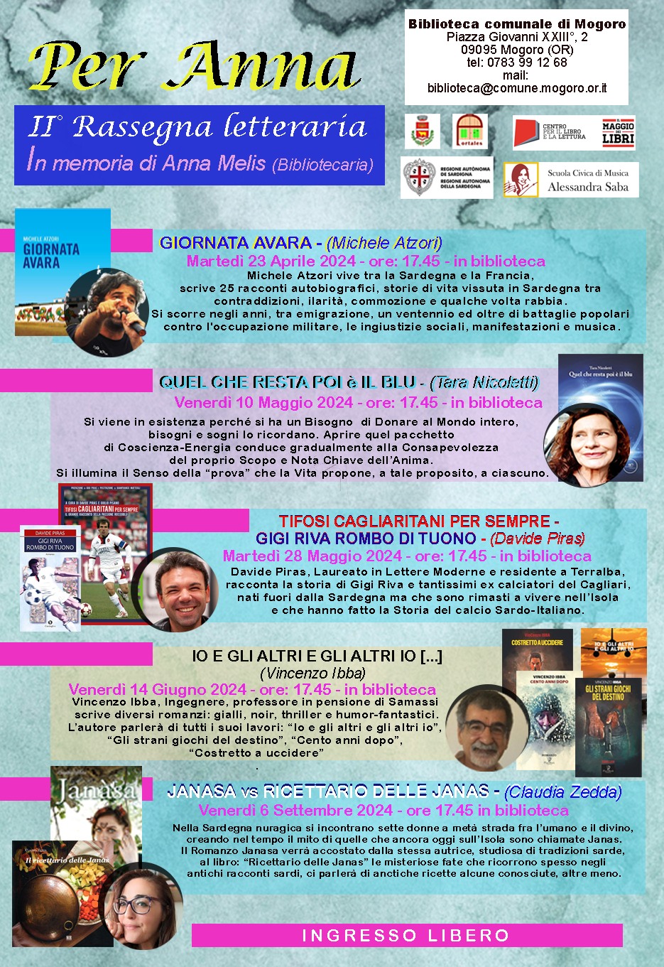 Martedì 23 Aprile 2024 (Giornata Mondiale del Libro) avrà inizio la II rassegna letteraria in ricordo della bibliotecaria di Mogoro Anna Melis.