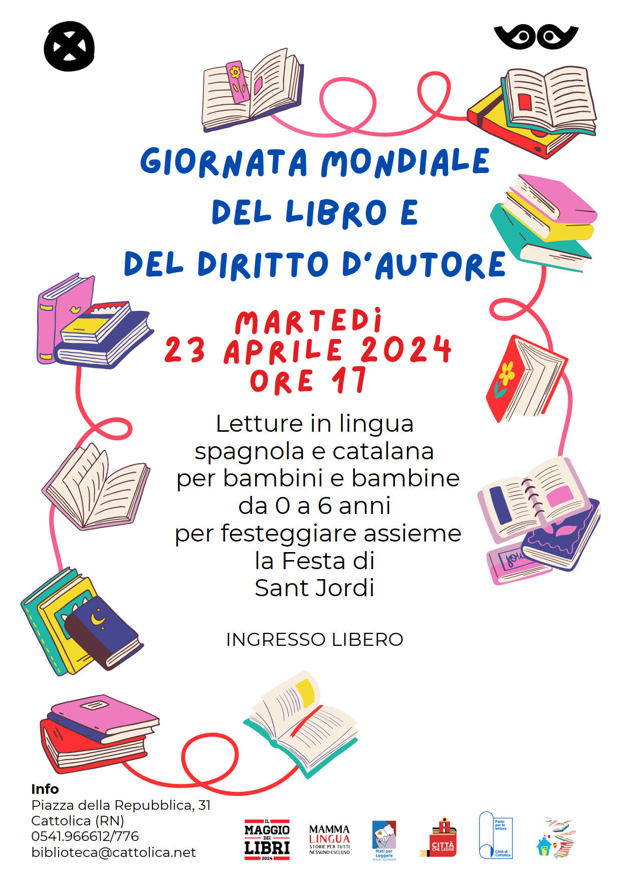 Martedì 23 aprile 2024 alle ore 17 un appuntamento speciale di lettura in lingua spagnola e catalana, per festeggiare assieme la Giornata mondiale del libro e del diritto d'autore, nota anche come Giornata del libro e delle rose.