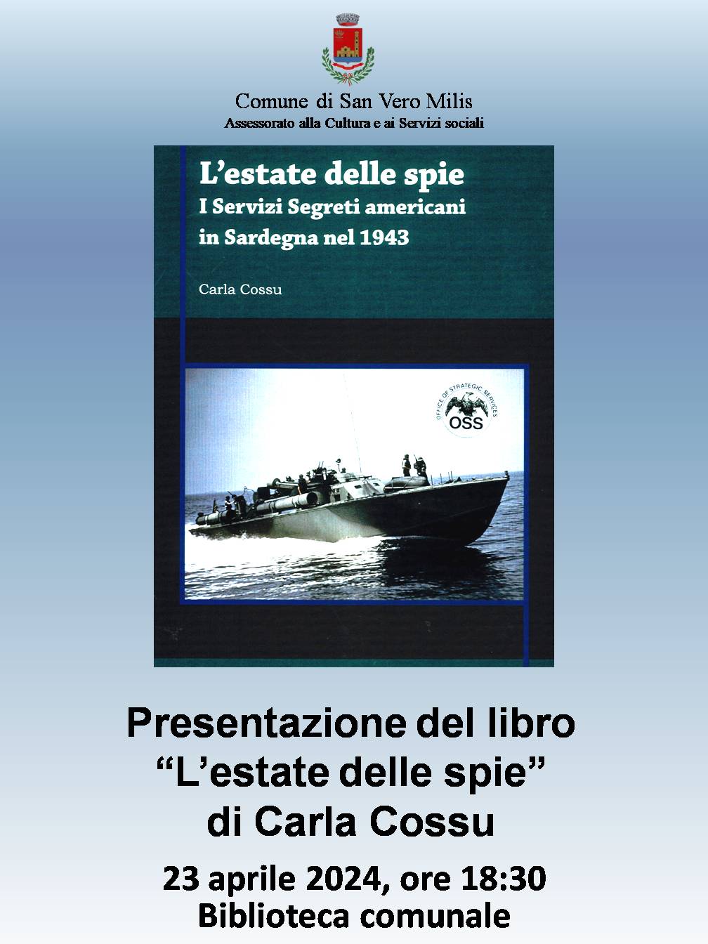 Martedi 23 aprile 2024 avremo il piacere di ospitare l ‘ autrice Carla Cossu con il suo interessante libro “ L’estate delle spie: I servizi Segreti americani in Sardegna nel 1943 “. Carla Cossu presidente dell’ANPI di Oristano si dedica da molti anni ad un accurato lavoro di ricerca storica , in questo libro analizza in particolare due missioni americane organizzate dall’office of strategic Service nella nostra isola.